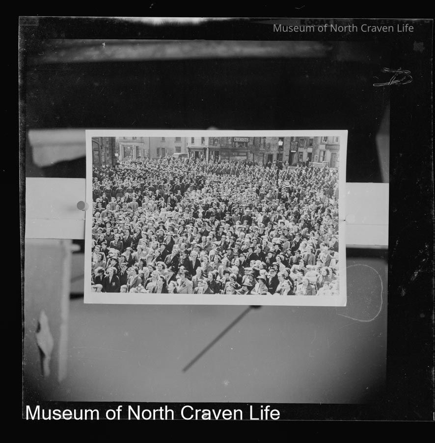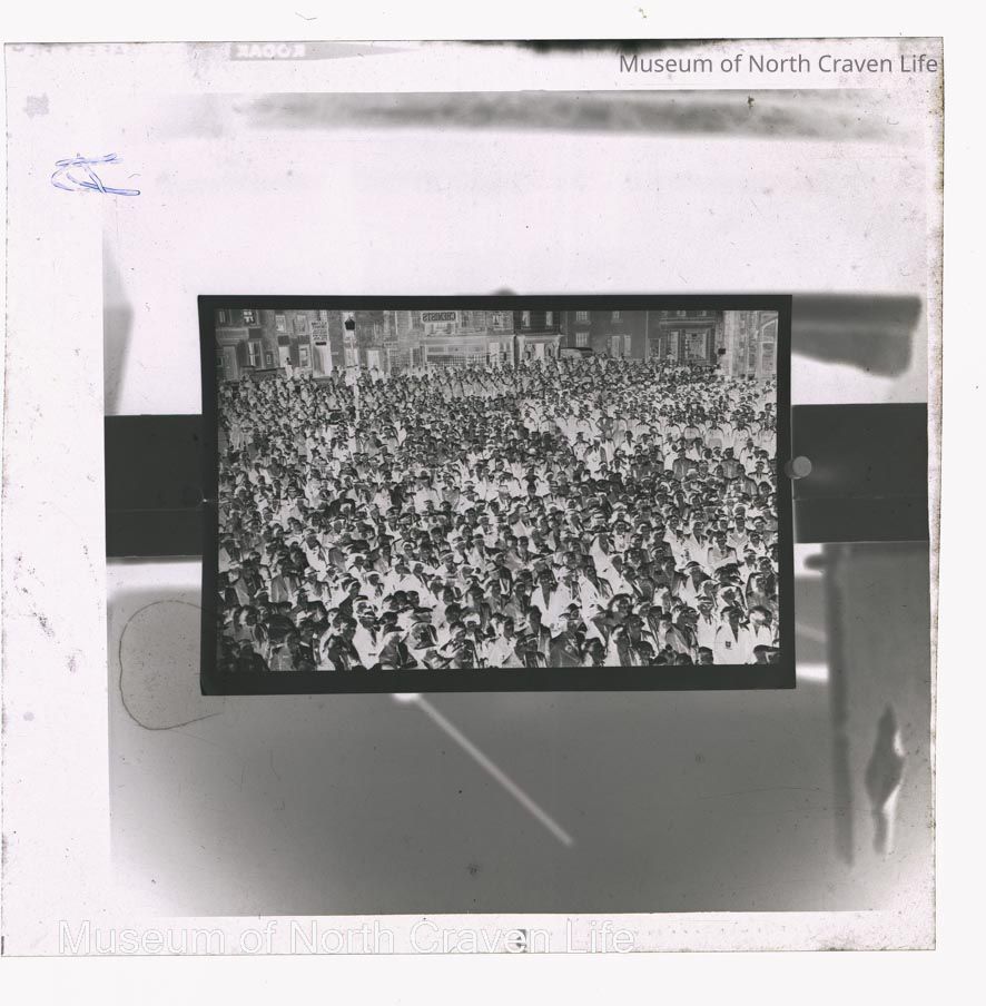 A silver film negative. A view of a group portrait of a crowd watching a Home Guard Victory Parade, 1945Collection