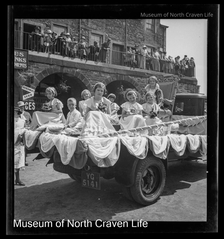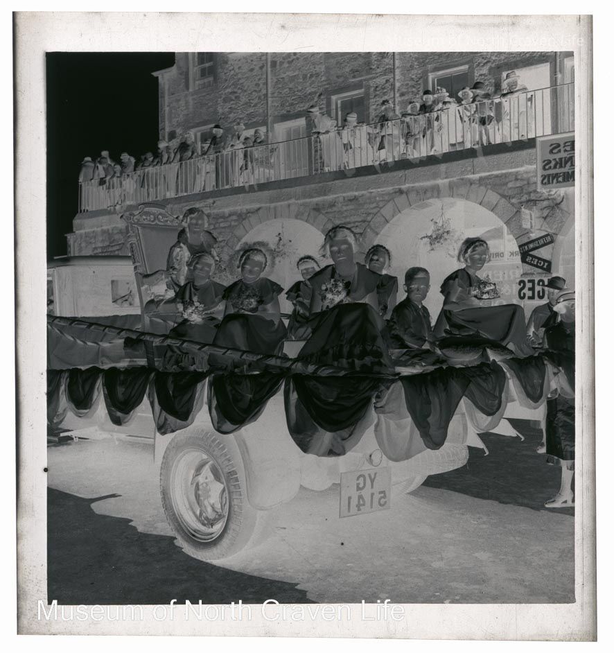 A 2 ¼" gelatin silver acetate film negative. A view of a group of girls on a decorated float in front of the Shambles in Settle. Bystanders observe them form the first floor of the ShamblesCollection