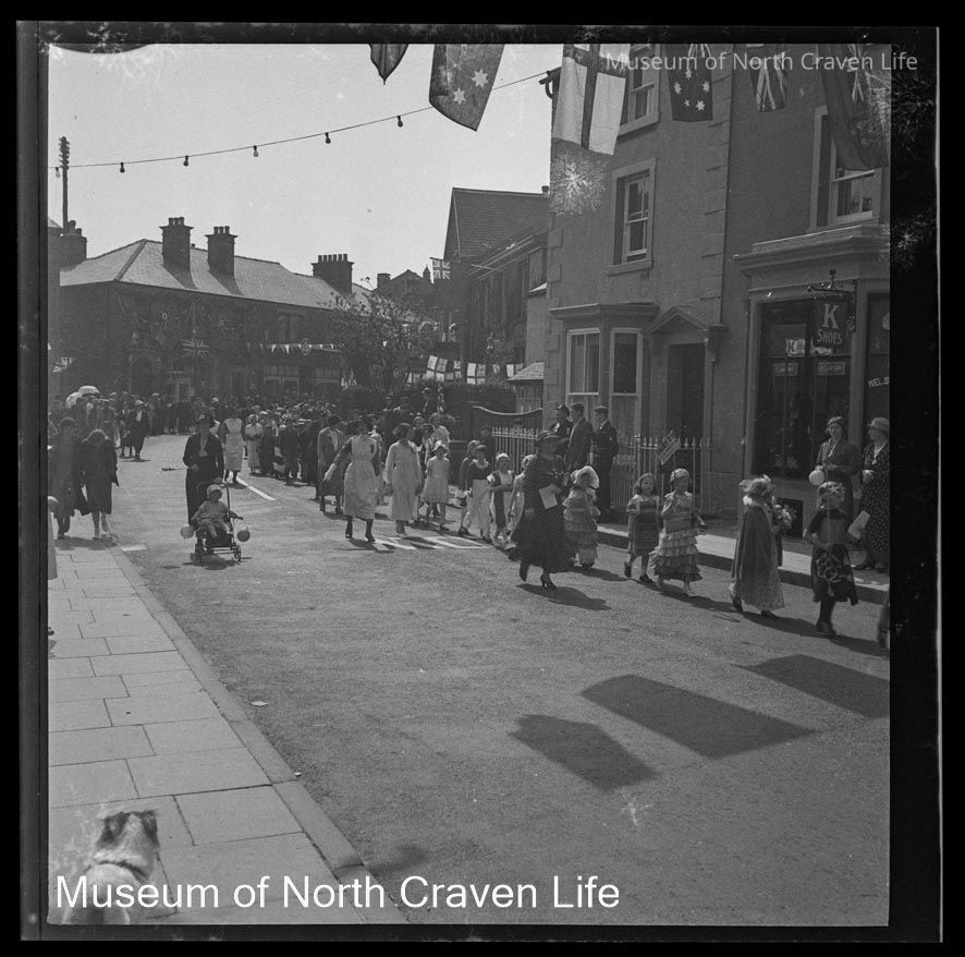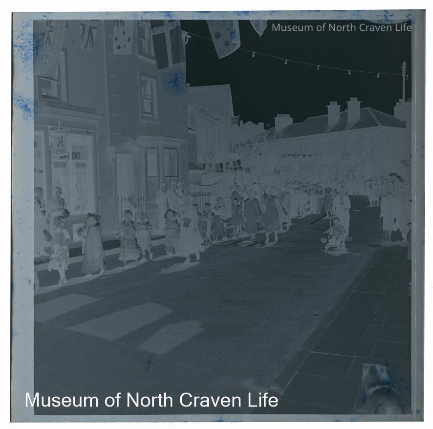 A 2 ¼" gelatin silver acetate film negative. Street scene : a view of a procession of children in costume in a street festooned with flags and flanked by onlookersCollection