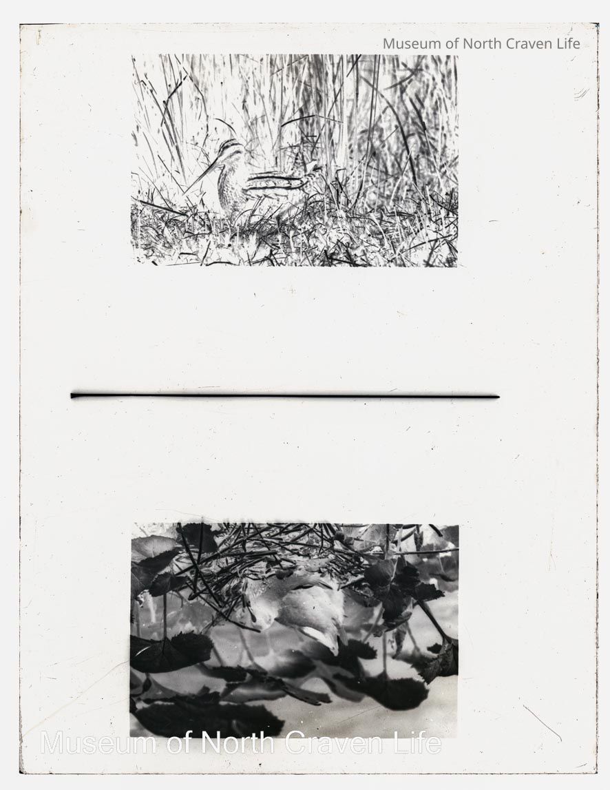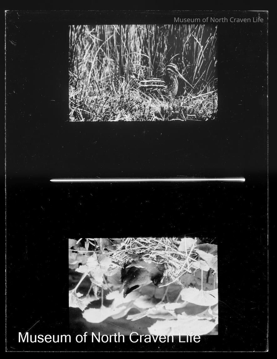 1: a bird camouflaged in reeds and long grass (a snipe); 2: a bird sitting on a nestCollection