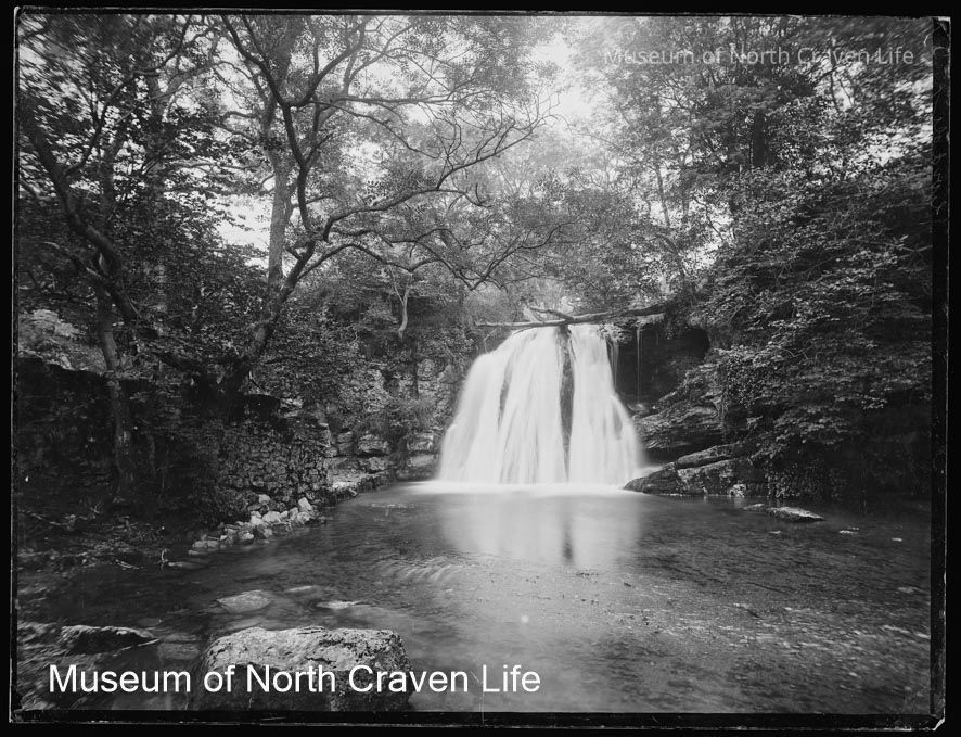 A full-plate gelatin silver glass negative. A view towards a small waterfall where the water cascades into a pool. Rocks edge the pool and trees rise up beside and behind the fall.Collection