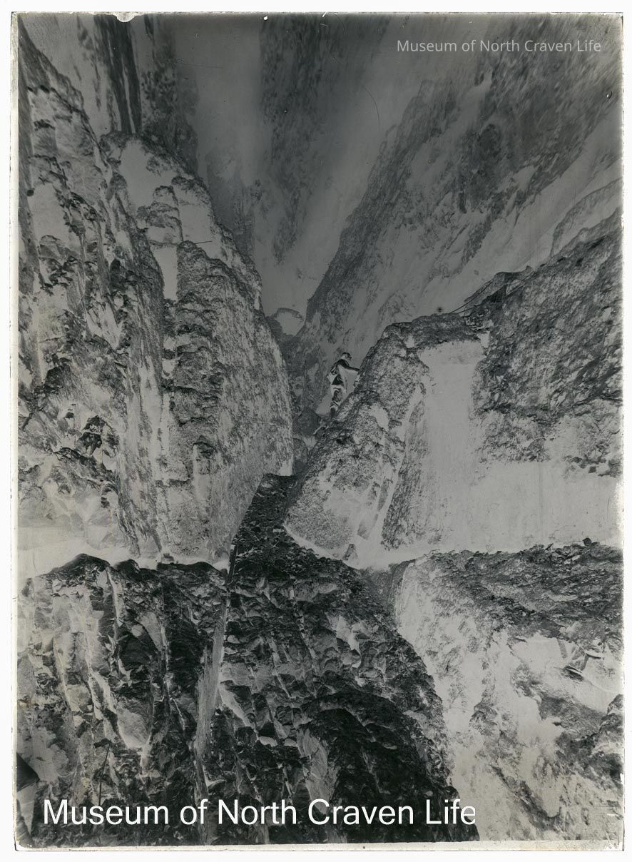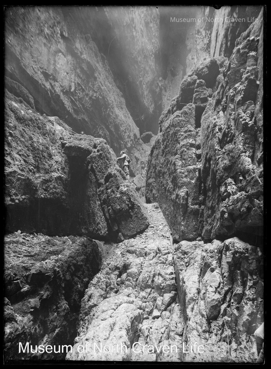 A half-plate gelatin silver glass negative. A view of a man pot holing. He stands on a rock face in a ravine, the walls of which rise up on either side of him. Possibly taken in the 20s or 30s.Collection