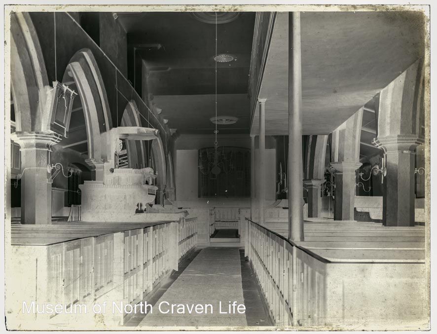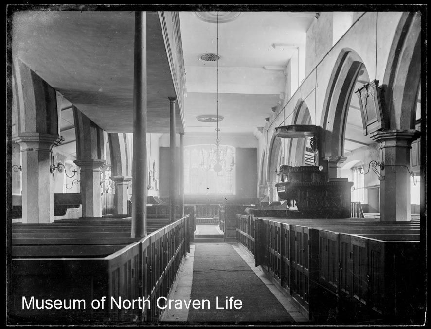 A full-plate gelatin silver glass negative. An interior view of the nave looking to the east and the altar of St. Alkelda's Church, Giggleswick. The pulpit is surrounded by box pews and there is a gallery along the left side of the nave.Collection