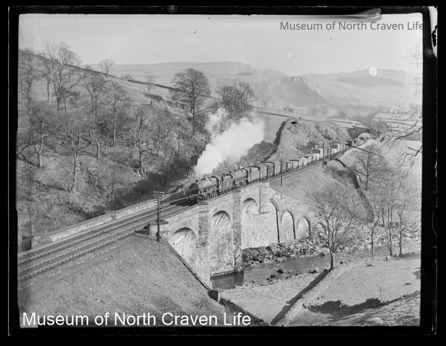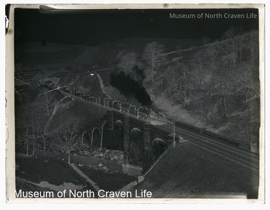 A quarter-plate gelatin silver glass negative. A view of a steam goods train crossing a viaduct over a river. In the background fells rise up with trees appearing in the middle groundCollection