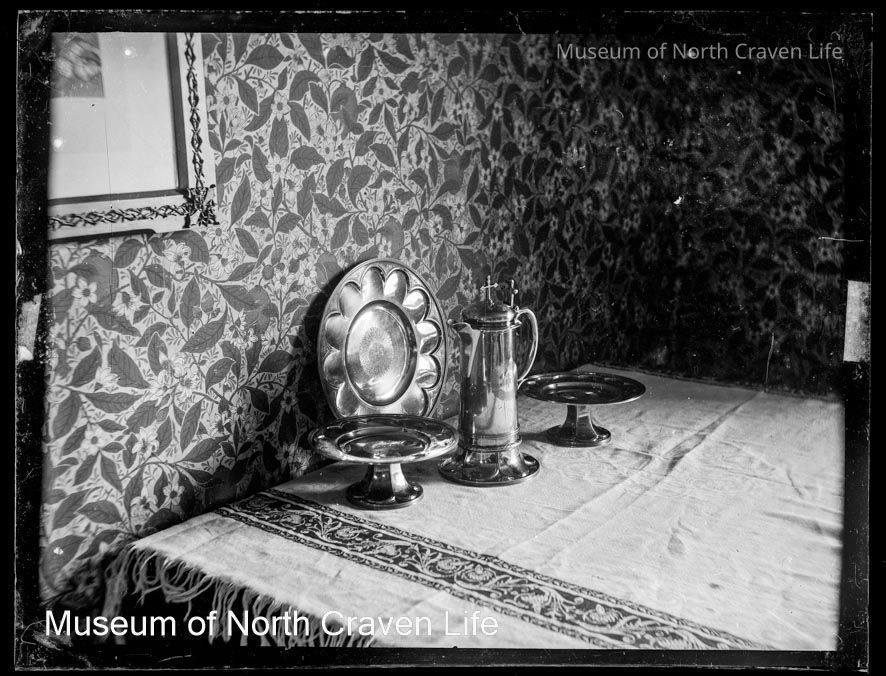 A quarter-plate gelatin silver glass negative. An image of a silver church communion set on a fringed tablecloth. Behind the table, the walls of the room are decorated with wallpaper and a paintingCollection