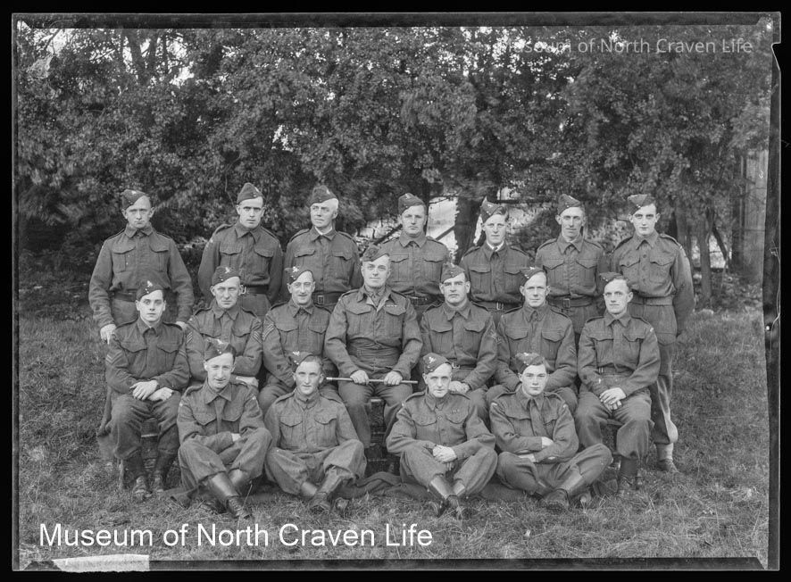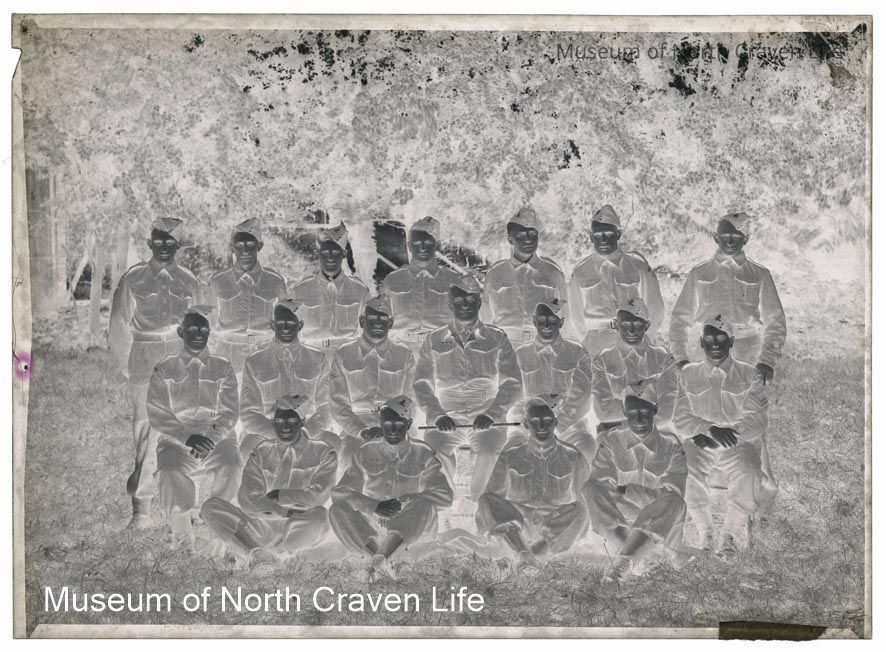 A nitrate film negative of a group portrait of soldiers with Commanding Officer. Filed with brown paper envelope (container) bearing the text in pencil "H.G. (BULLOCK)". Front row, last on the right, is James Taylor (born 1925) from Rathmell.Collection