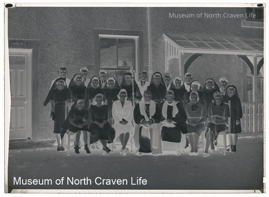 An acetate film negative. A group portrait of priests and nuns. Taken outside the Golden Lion, Horton in Ribblesdale.Collection