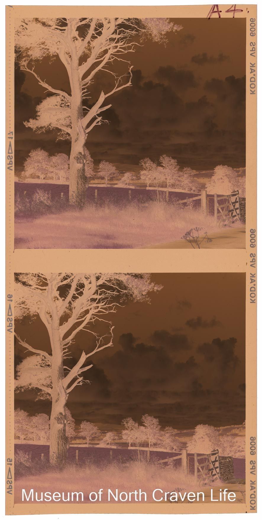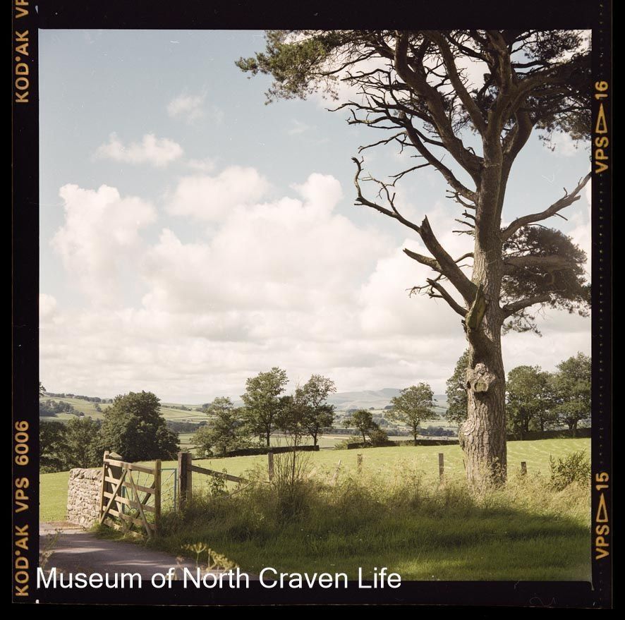A 2¼" colour film negative. An image of the view from Mearbeck, Long Preston : gate, clouds and trees with hills in the distanceCollection