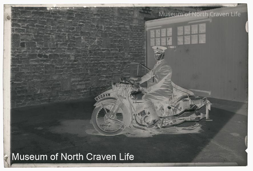 A gelatin nitrate silver film negative. A portrait of a policeman in uniform mounted on a motorcycle with a sidecar (possibly a Matchless motorcycle).Collection