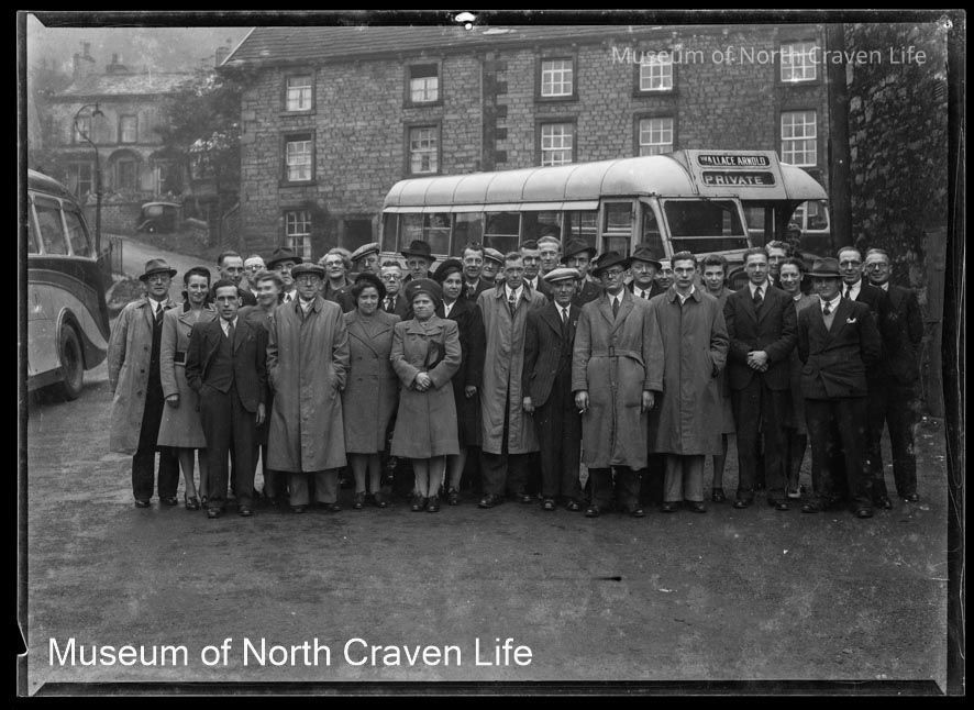 An nitrate film negative. Group of 33 men and women posed in front of a Wallace Arnold bus at the bottom of Constitution Hill, Settle.Collection