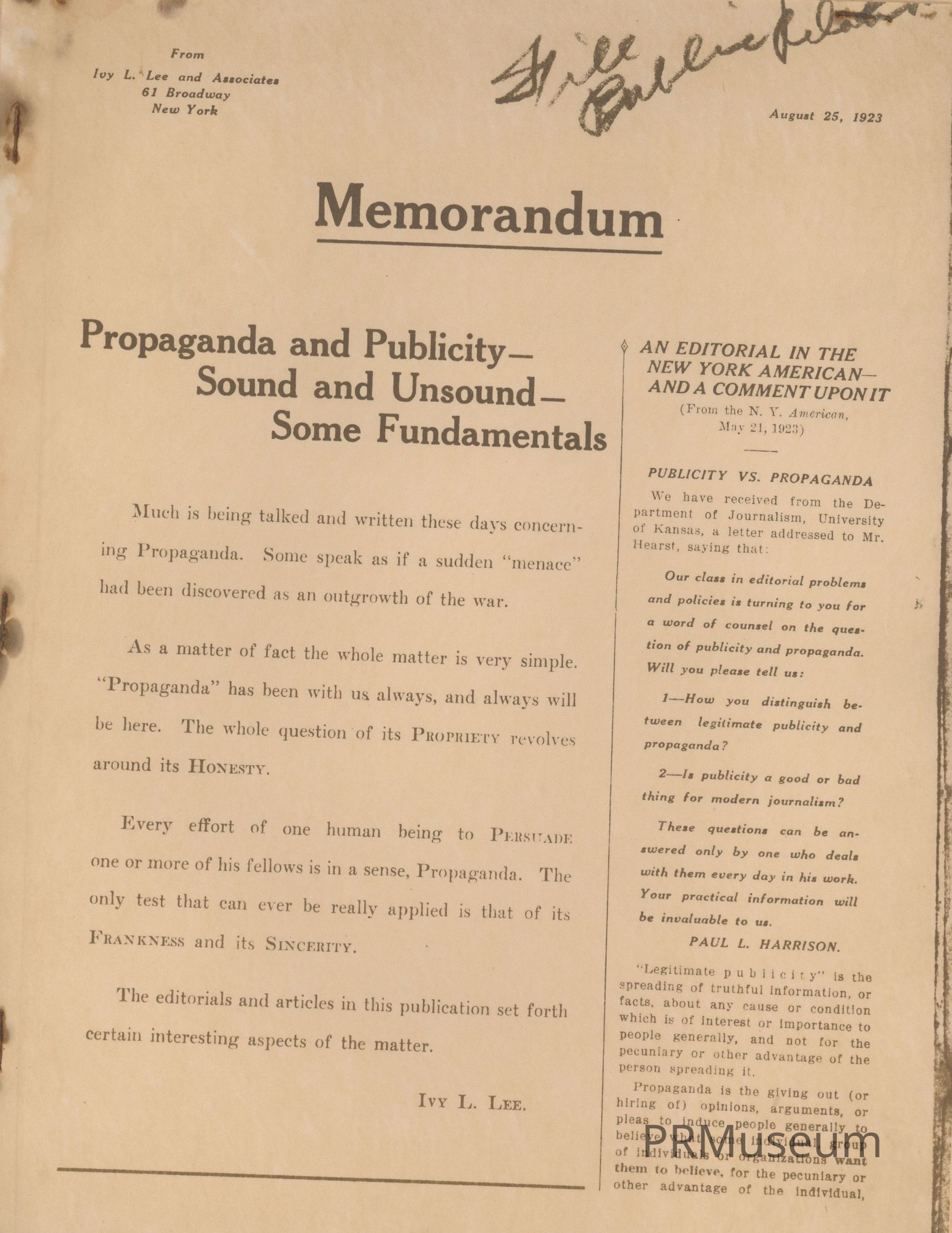 An article published by Ivy Lee regarding the concern around propaganda and how it relates to publicity.Context
