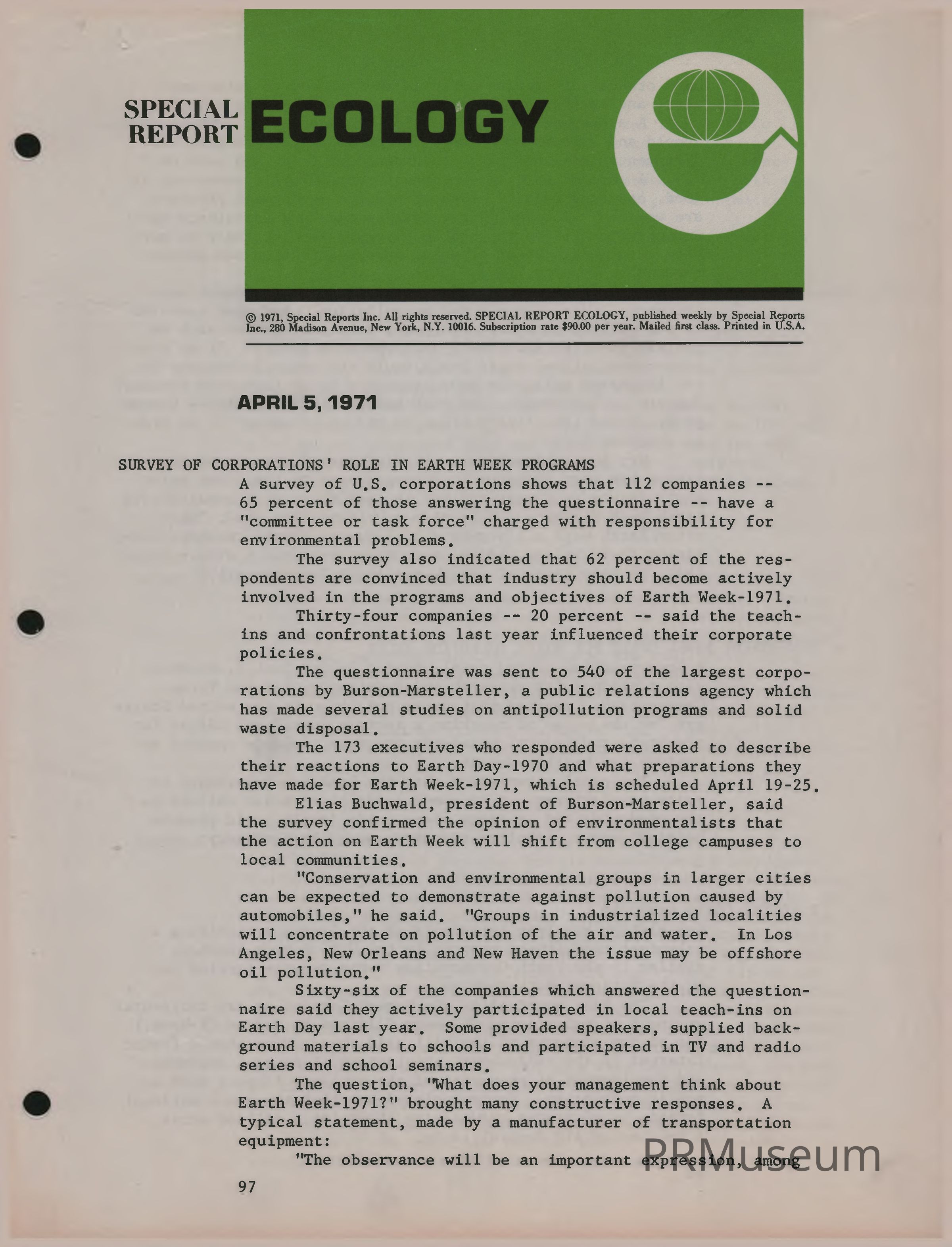 Elias "Buck" Buchwald, President of Burson-Marsteller at the time of publication, sent a questionnaire to 540 corporations who were asked to describe their reactions to Earth Day 1970 and the preparations they made for Earth Day 1971.Collection