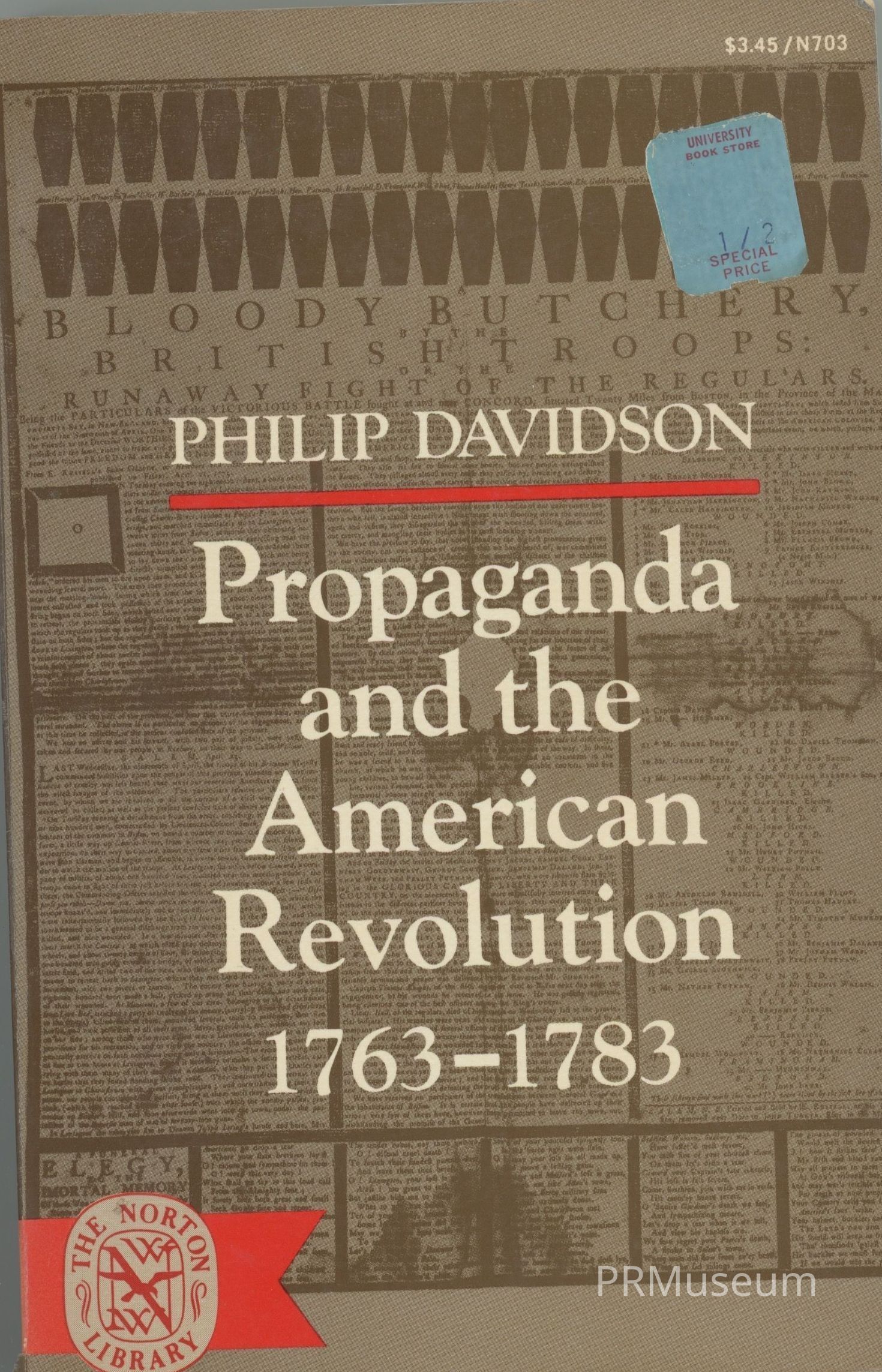 Philip Davidson was a professor and author. The book explores the goals, machinery, and tactics of revolutionary propaganda from 1763 to 1783, as well as the Tory counterattack, examining the use of pamphlets, newspapers, public addresses, songs, and more. Davidson makes a point that without the work of propagandists in the American Revolution, independence would not have been declared in 1776 nor recognized in 1783.Category