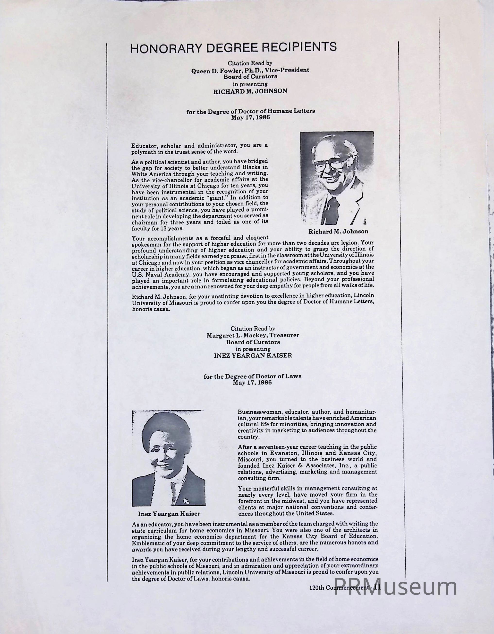 Citation for Inez Kaiser to receive honorary degree, 120th commencement, Lincoln University of MissouriCreated By