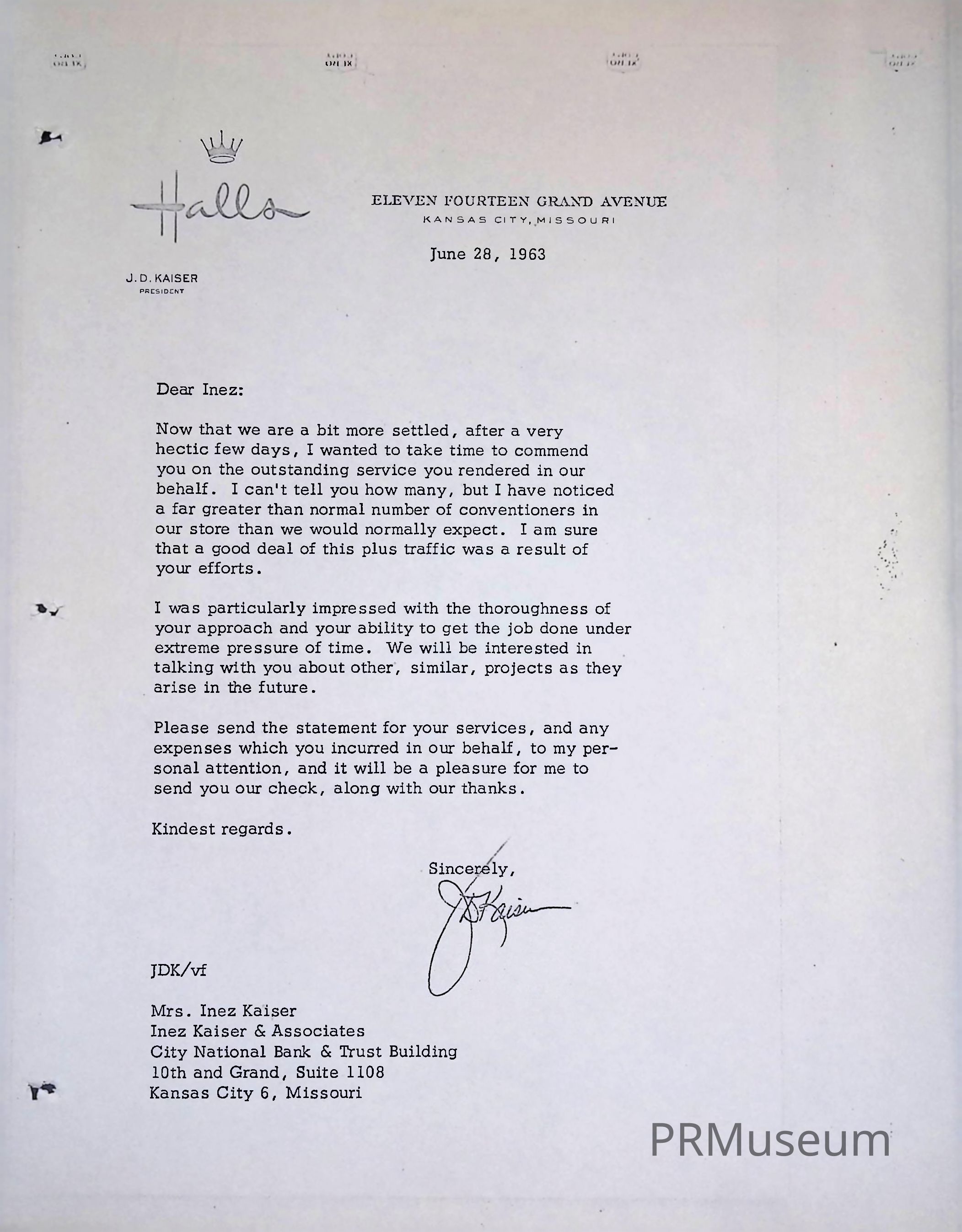 Thank you letter to Inez Kaiser from J. D. Kaiser, president, HallsEntry/Object ID