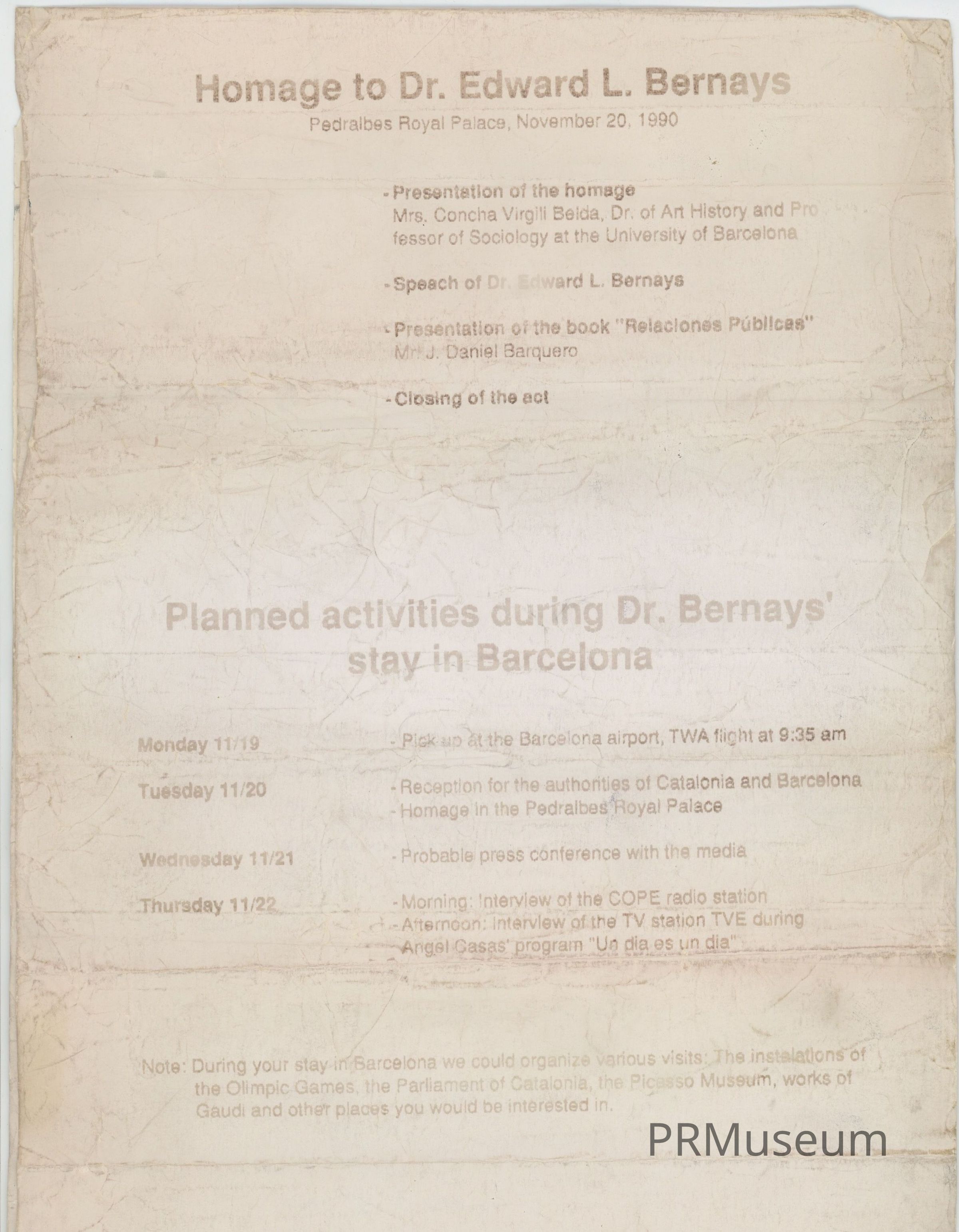 Homage to Dr. Edward Bernays: Planned activities during Dr. Bernays' stay in BarcelonaEntry/Object ID