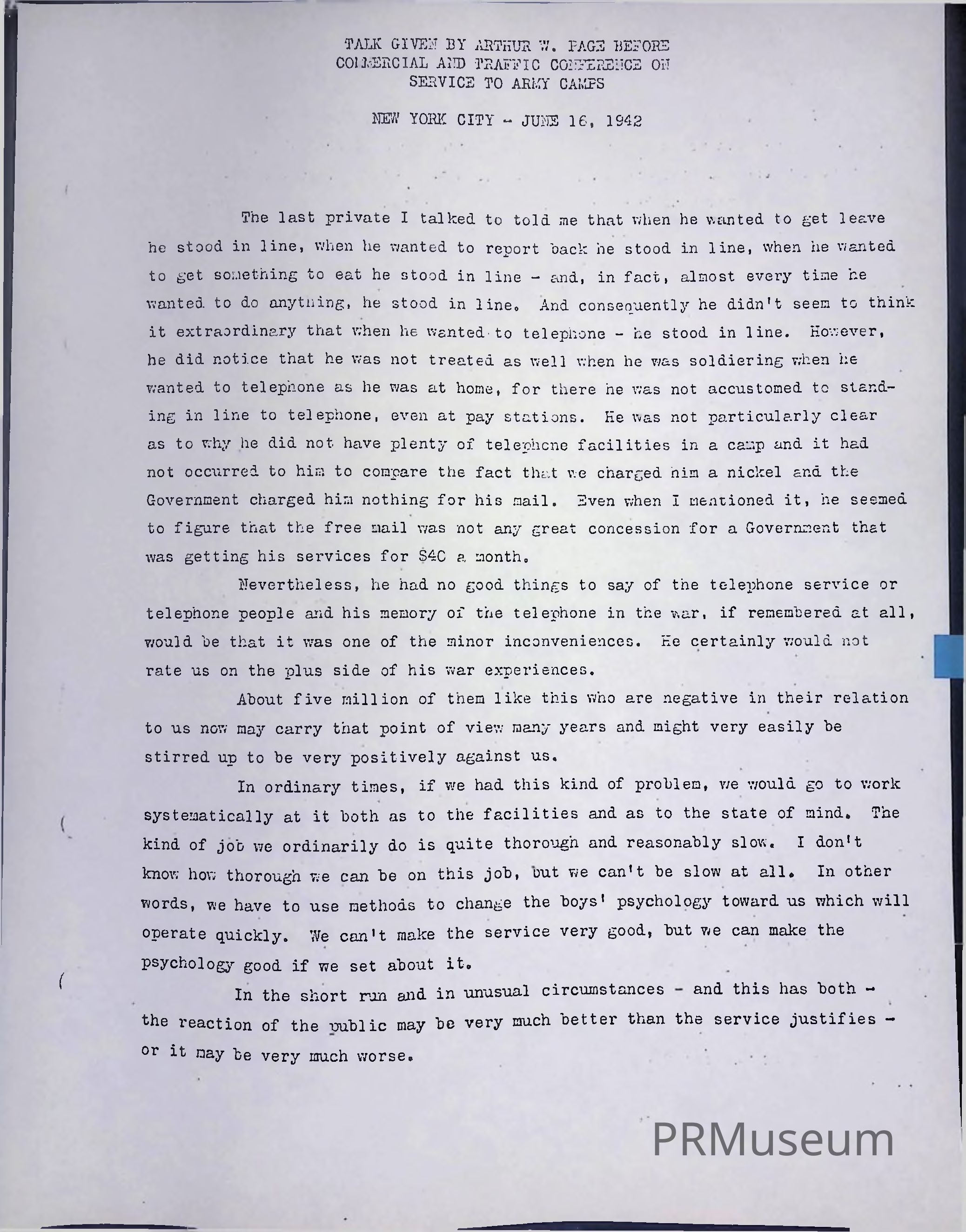 Arthur W. Page gives a talk to to Army Camps in New York City.Context