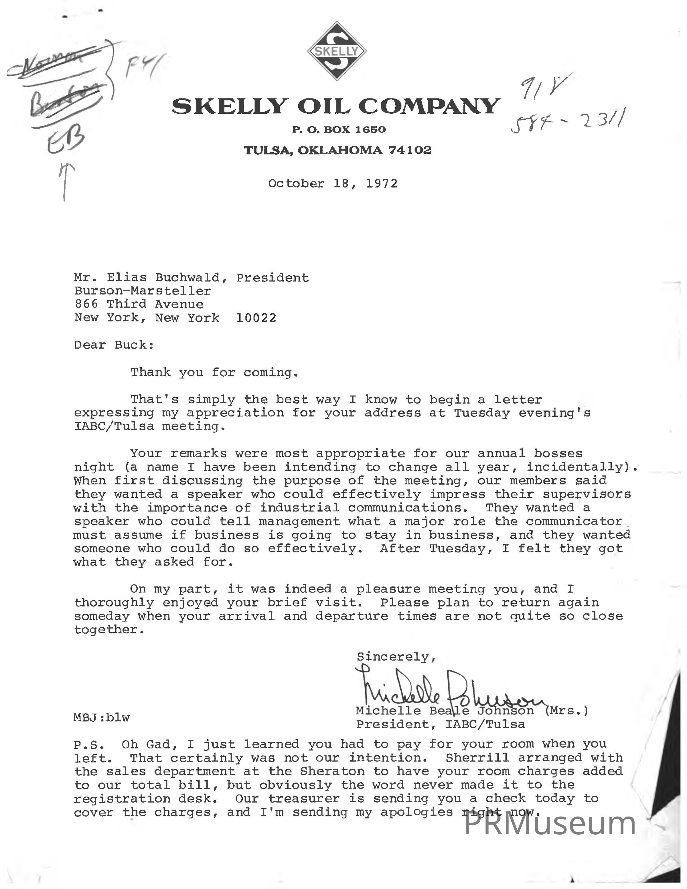 President of Skelly Oil Company, Michelle Johnson-Skelly, writes letter to Elias "Buck" Buchwald, President of Burson-Marsteller, thanking him for his address IABC/Tulsa meeting in 1972Collection