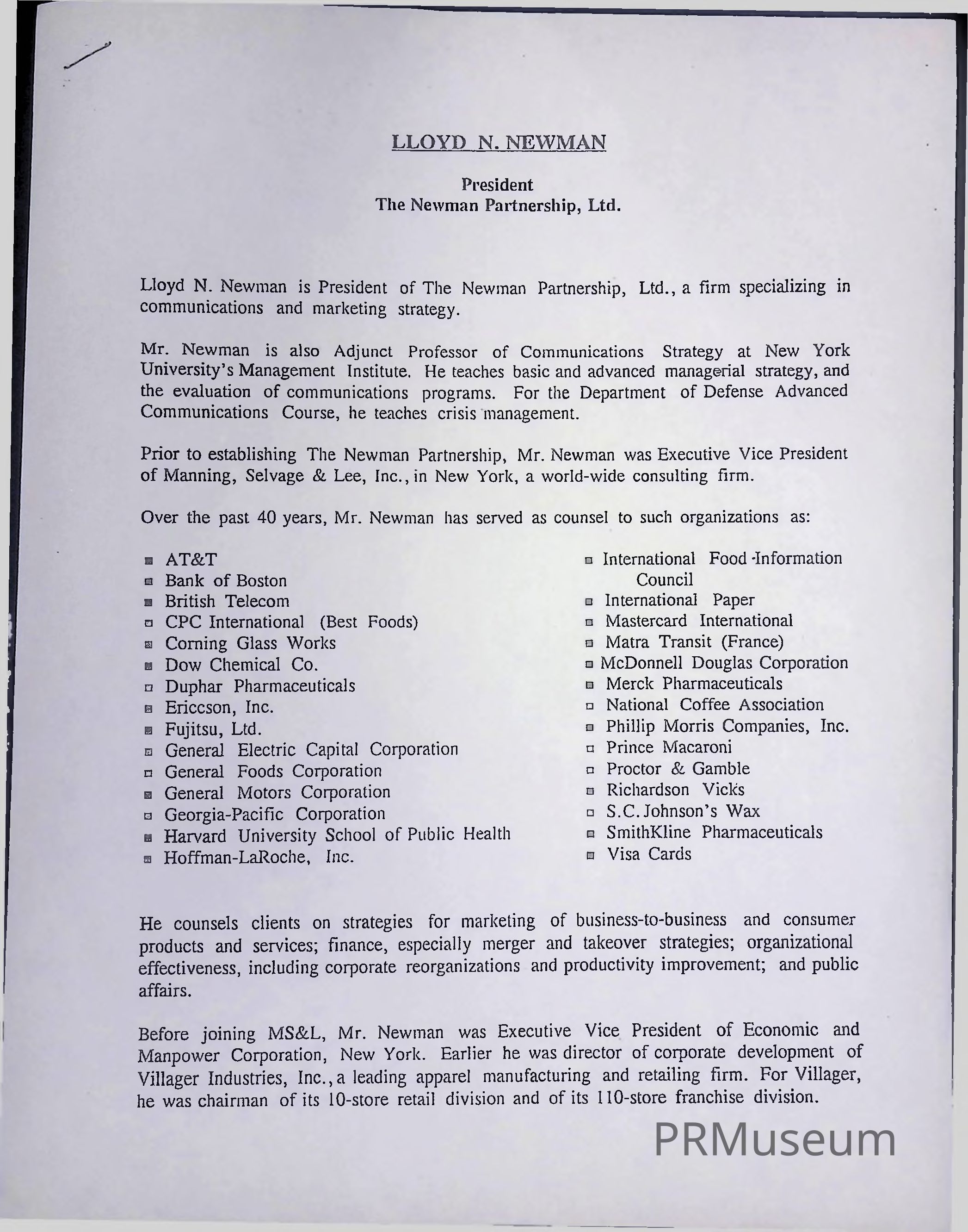 Papers of Lloyd N. Newman, President, The Newman Partnership, Ltd.Entry/Object ID