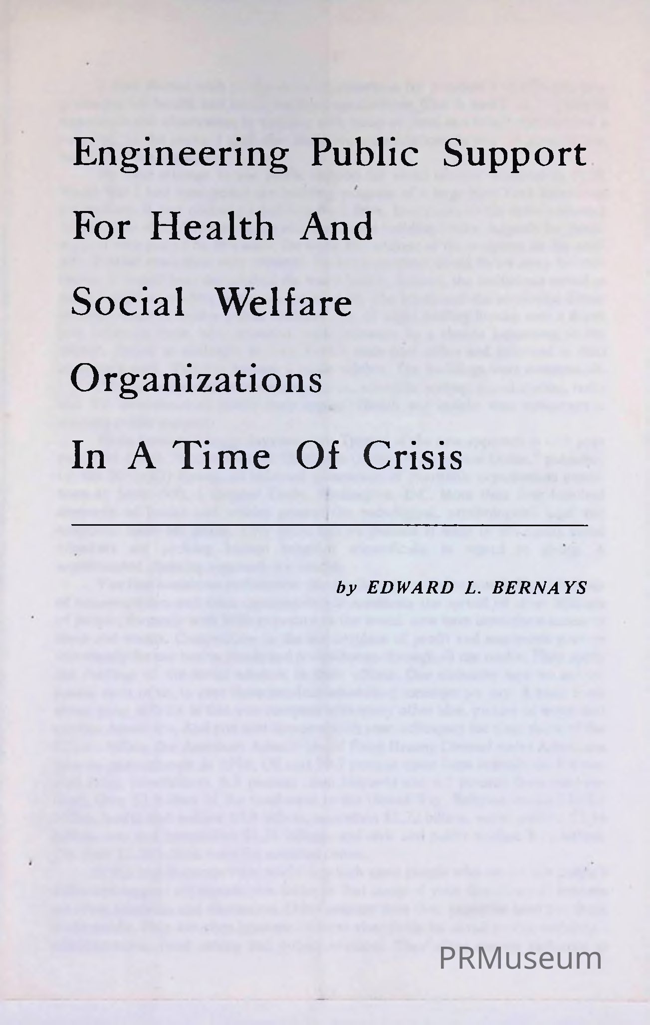 Edward Bernays discusses the underlying principles for practical and effective programming for health and social welfare organizations. Bernays recounts his first attempt to win public support for social services in 1920 because of World War I interrupting a building program of a large New York federation for welfare. Additionally, Bernays lays out an eight-point program for tactics to effectively gain more public support for health and social welfare organizations.Acquisition