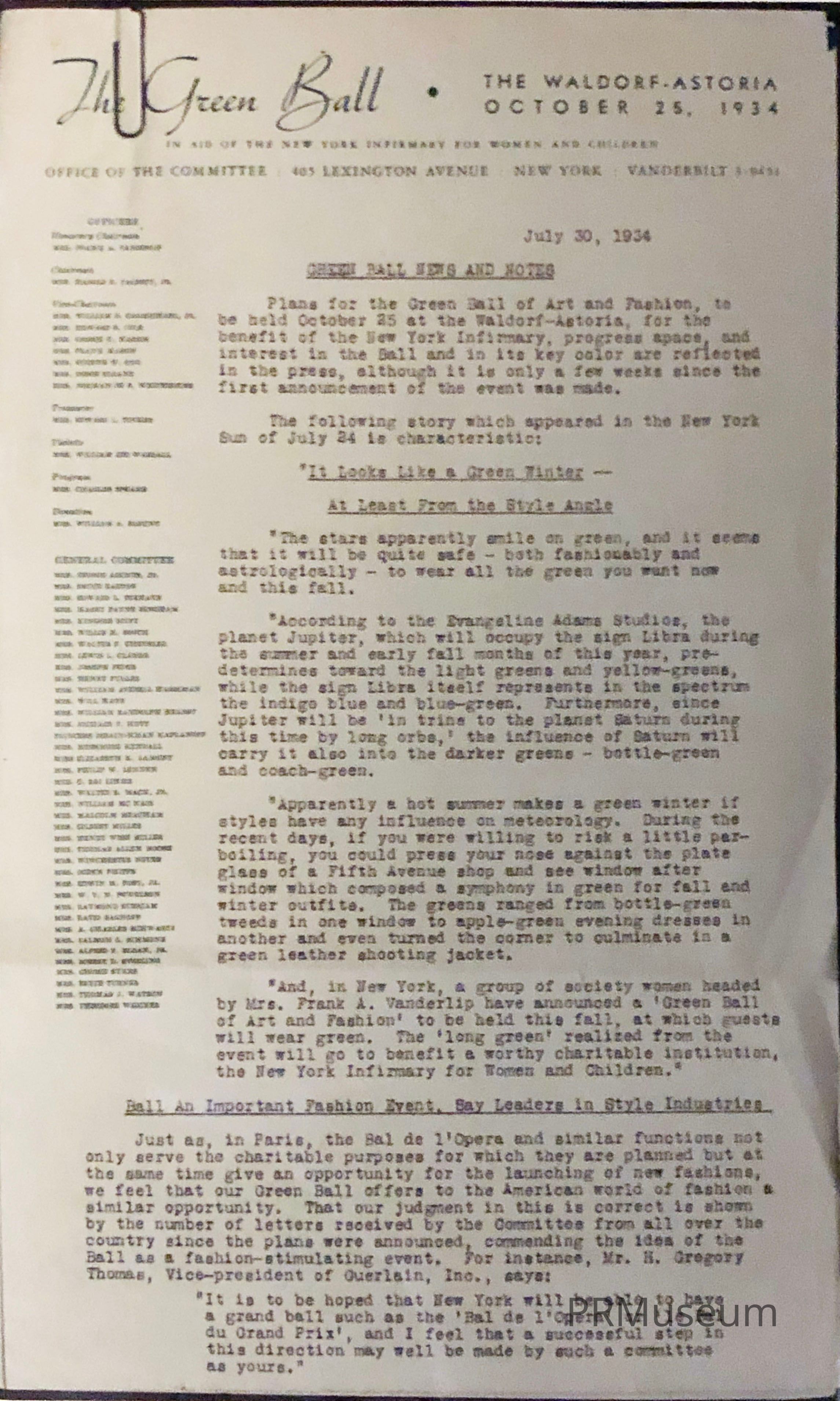 Green Ball News and Notes. Two-page release about the event on Green Ball Committee stationery.Acquisition