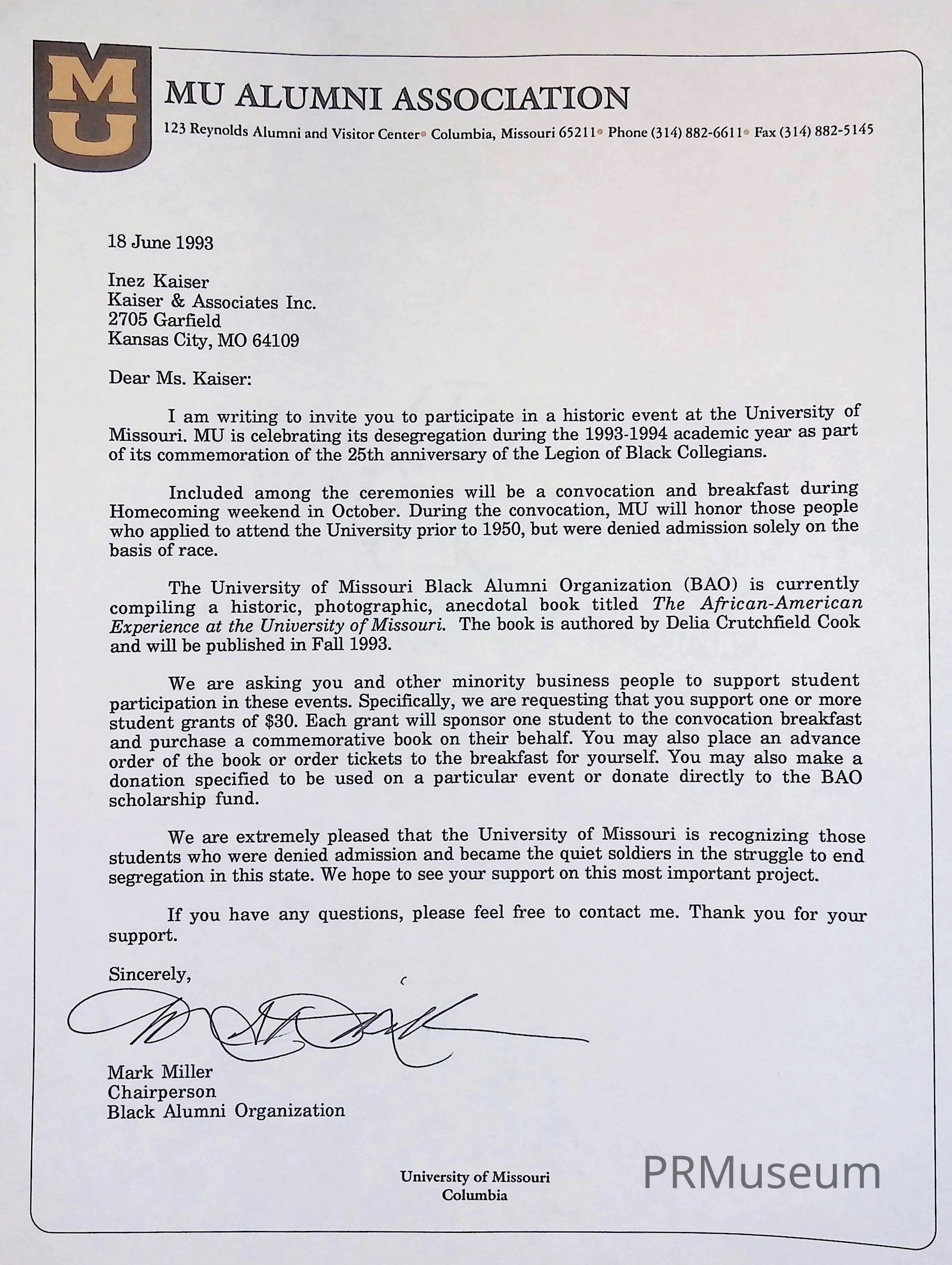 Inez Kaiser was a public relations pioneer and first black woman to own a public relations firm. In this letter, the University of Missouri is inviting Kaiser to participate in their event celebrating the university's desegregation as part of its commemoration of the 25th anniversary of the Legion of Black Collegians. The BAO (Black Alumni Organization) were compiling a historic book and is requesting the support of minority business people for student participation in the upcoming events.Letter Details