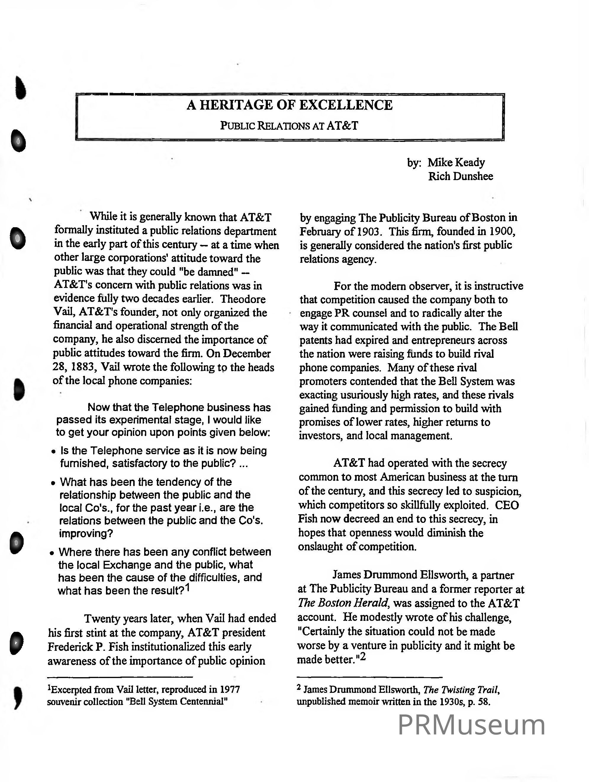 Mike Keady and Rich Dunshee are public relations practitioners and writers. In this report, the authors discussed the roles of Theodore Vail, the founder of AT&T and James Drummond Ellsworth, the first president of the public relations department, within the company and how they radically altered the way a company communicates with its publics.Publication Details