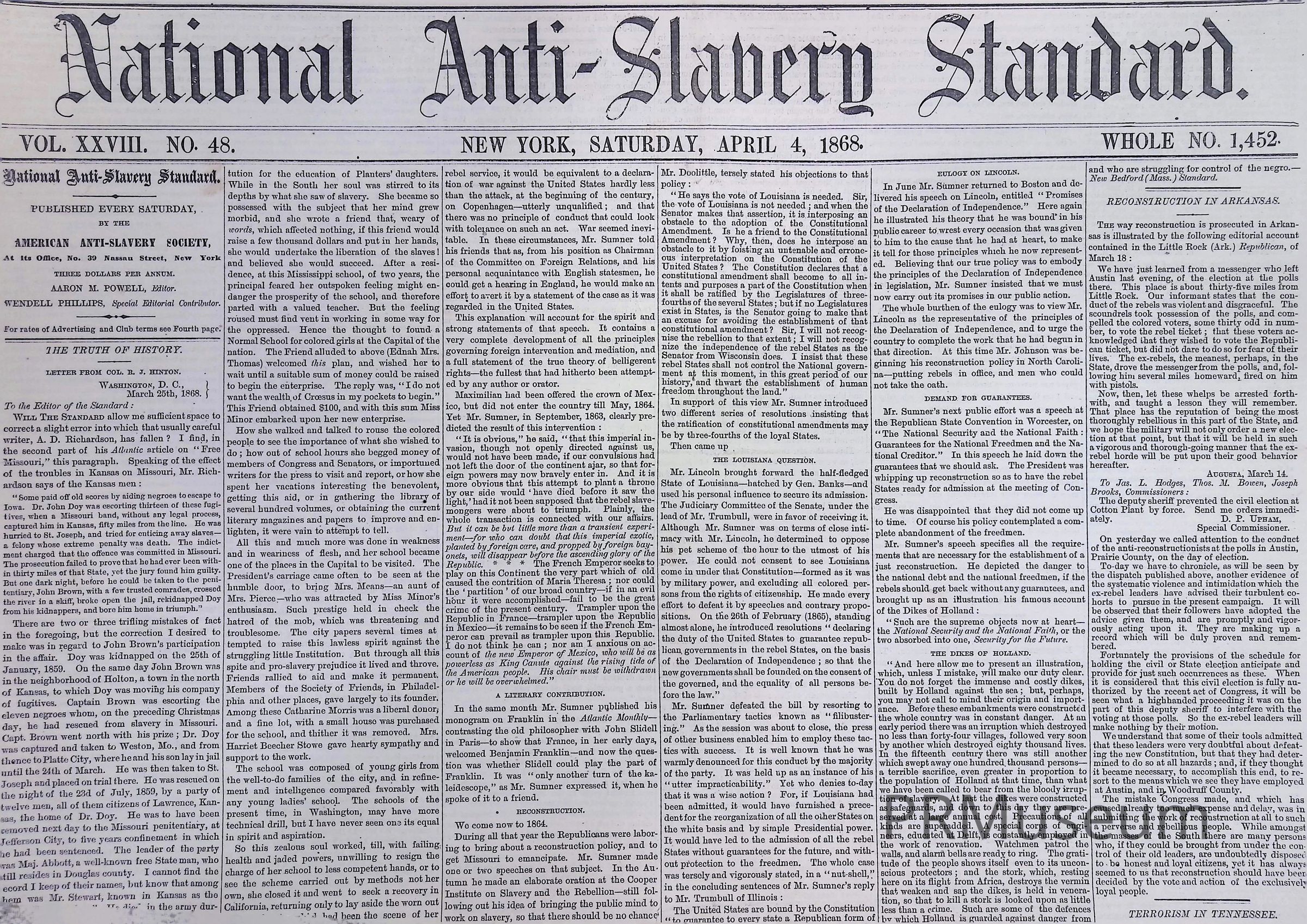 A weekly published newspaper of the American Anti-Slavery Society in 1868.Acquisition