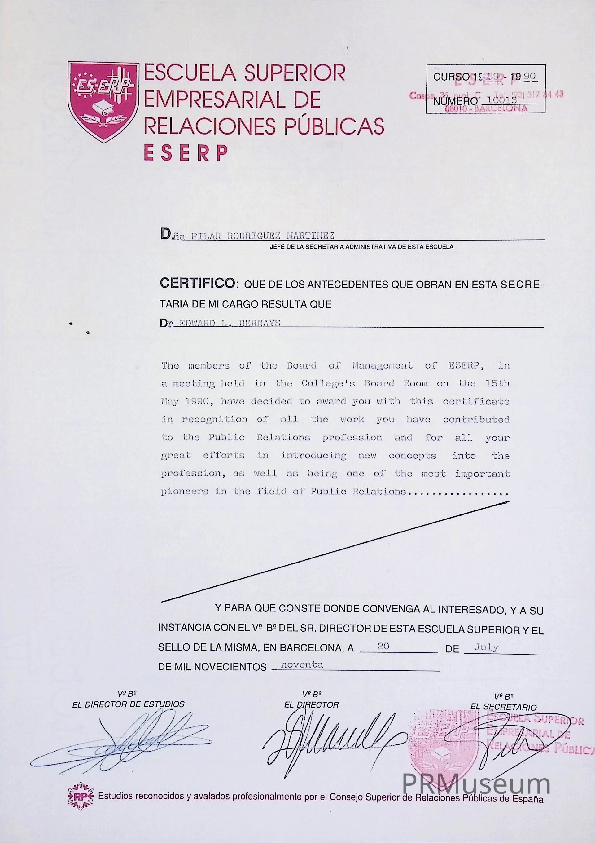 A certificate awarded to Edward Bernays for the contributions he made to the profession of public relations.Acquisition