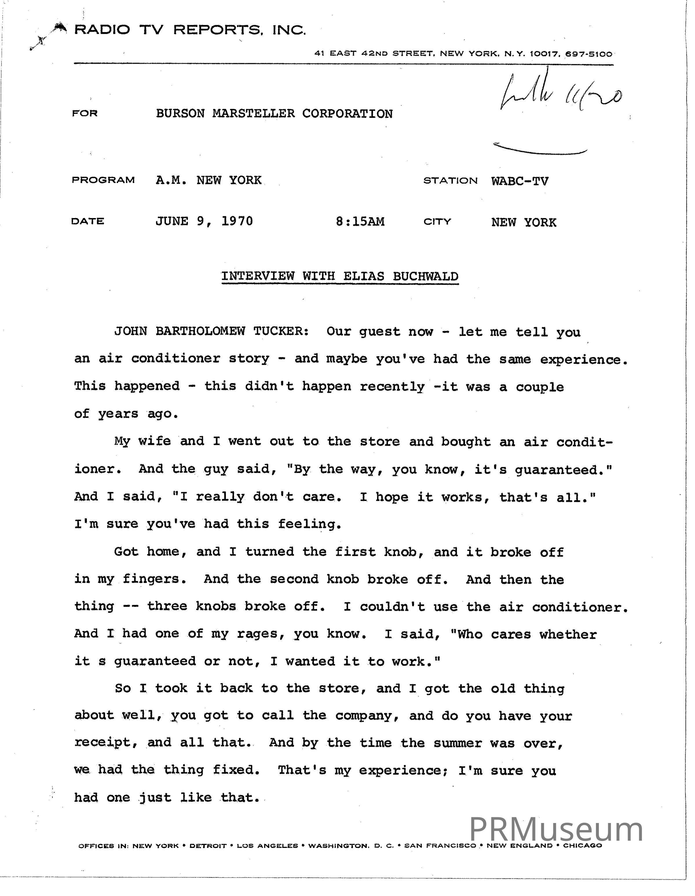 Elias "Buck" Buchwald, President of Burson-Marsteller, was interviewed by John Bartholomew Tucker regarding consumer distrust in 1970.Collection