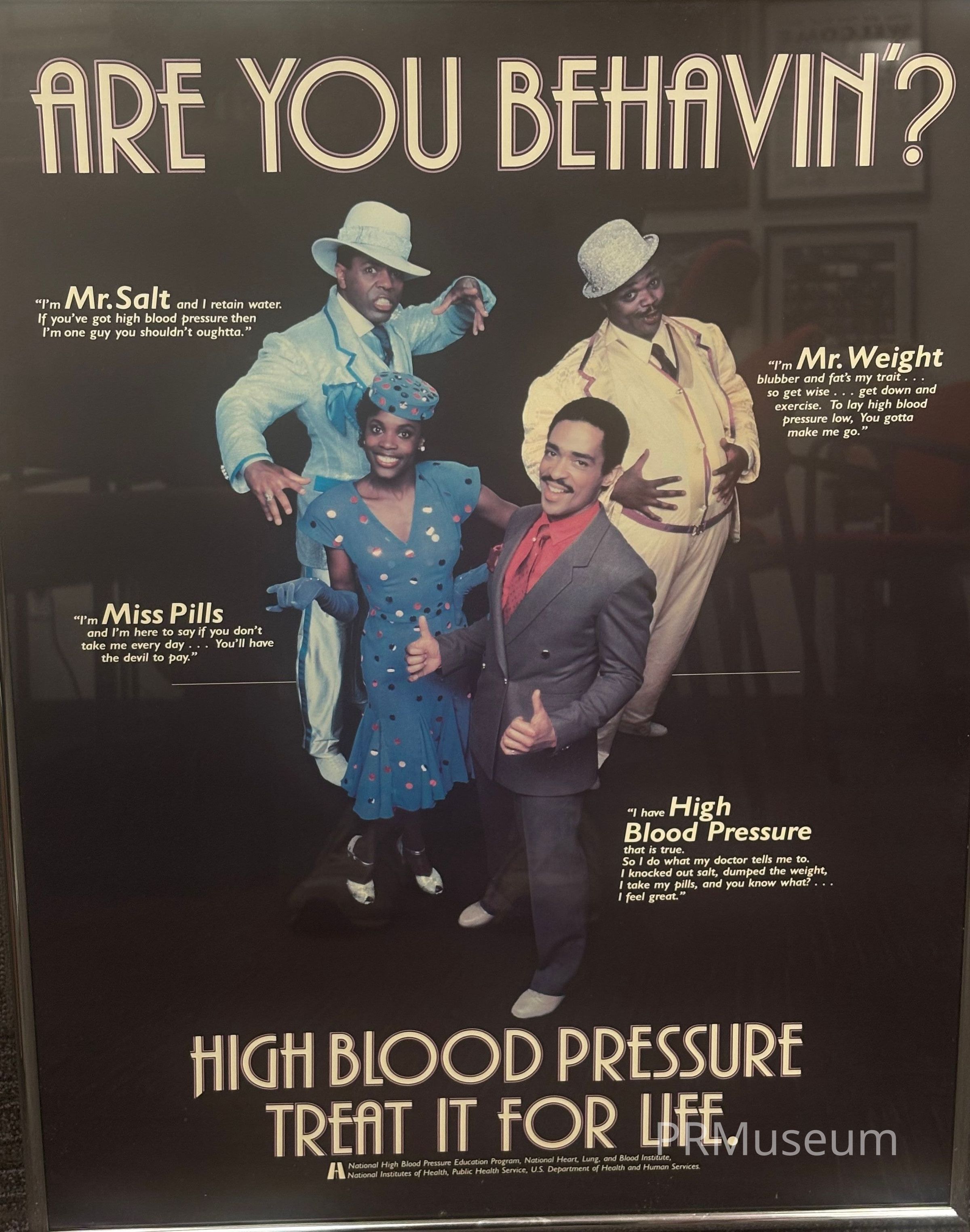 The National High Blood Pressure Program campaign features fictional characters: Mr. Salt, Mr. Weight, and Miss Pills; each designed to educate the public about common risk factors for high blood pressure. Mr. Salt highlights the dangers of water retention from excessive sodium intake, Mr. Weight warns against the impact of weight gain, and Miss Pills emphasizes the importance of adhering to prescribed blood pressure medications.Collection