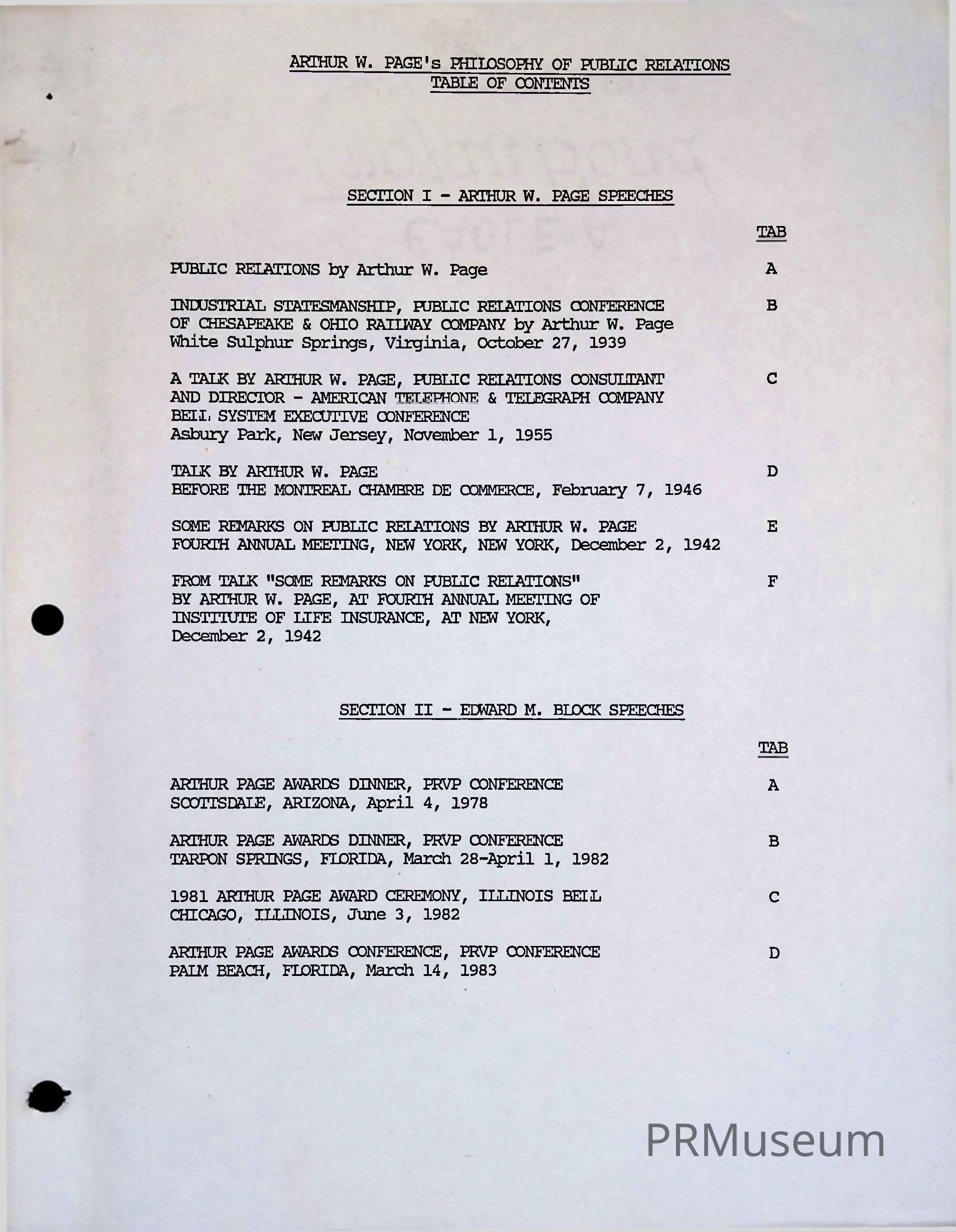 Binder containing speeches by Arthur Page assembled by Edward M. Block: 1) Public Relations by A. W. Page, n.d.; Industrial Statesmanship (Public relations conference of Chesapeake & Ohio Railway Company, Oct. 27, 1939; A Talk by Arthur Page, Bell System Executive Conference at Asbury Park, N.J., Nov. 1, 1955; Talk by Arthur W. Page before the Montreal Chambre de Commerce, Feb. 7, 1946; Some Remarks on Public Relations by Arthur W. Page, Fourth Annual Meeting, New York, N.Y., Dec. 2, 1942; Speeches by Ed Block: Arthur Page Awards Dinner, PRVP Conference, Scottsdale, Arizona, April 4, 1978; Arthur Page Awards Dinner, PRVP Conference, Tarpon Springs, Florida, March 28–April 1, 1982; 1981 Arthur Page Award Ceremony, Illinois Bell, Chicago, Ill., June 3, 1982; Arthur Page Awards Dinner, PRVP Conference, Palm Beach, Florida, March 14, 1983