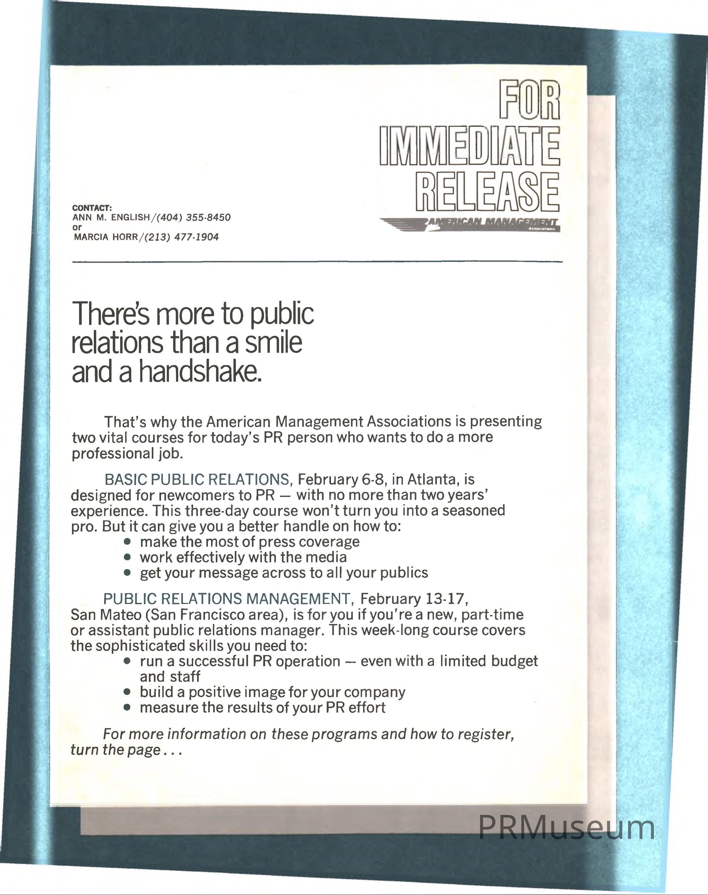Elias "Buck" Buchwald was a guest speaker for "Basic Public Relations", a course designed by the American Management Association for newcomers in the public relations industry. A separate course titled "Public Relations Management" is offered for PR professionals who want to cultivate new skills to manage a successful PR operation.Collection