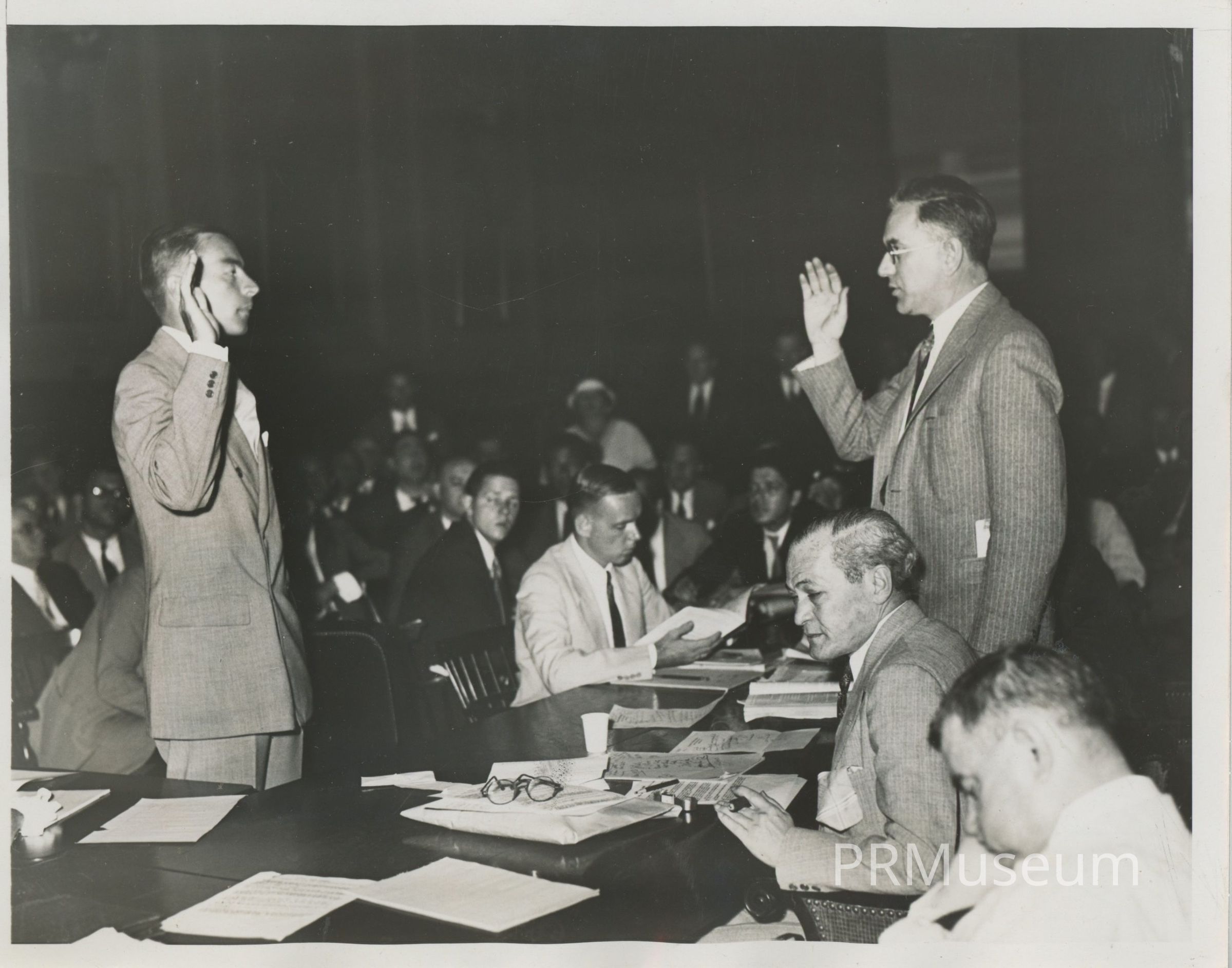 Press photo. Copy on reverse: Ivy Lee advised Hitler on Rearmament Policy at a salary of $25,000 a year. Ivy Lee, New York City Publicity Expert, is supplying the German Dye Trust with advice on German Rearmament, which is forwarded to the Nazi Government. This was brought out on July 11 at the public hearing before the Congressional Subcommittee in New York City investigating un-American activities. In Lee's absence, his partner, Burnham Carter, was called to the witness stand. This photo shows Burnham Carter (left) testifying. On right of table, across from the witness are Congressmen Will Taylor, John McCormack, chairman of the committee, and Samuel Dickstein, Credit line (Acme) 7/11/34