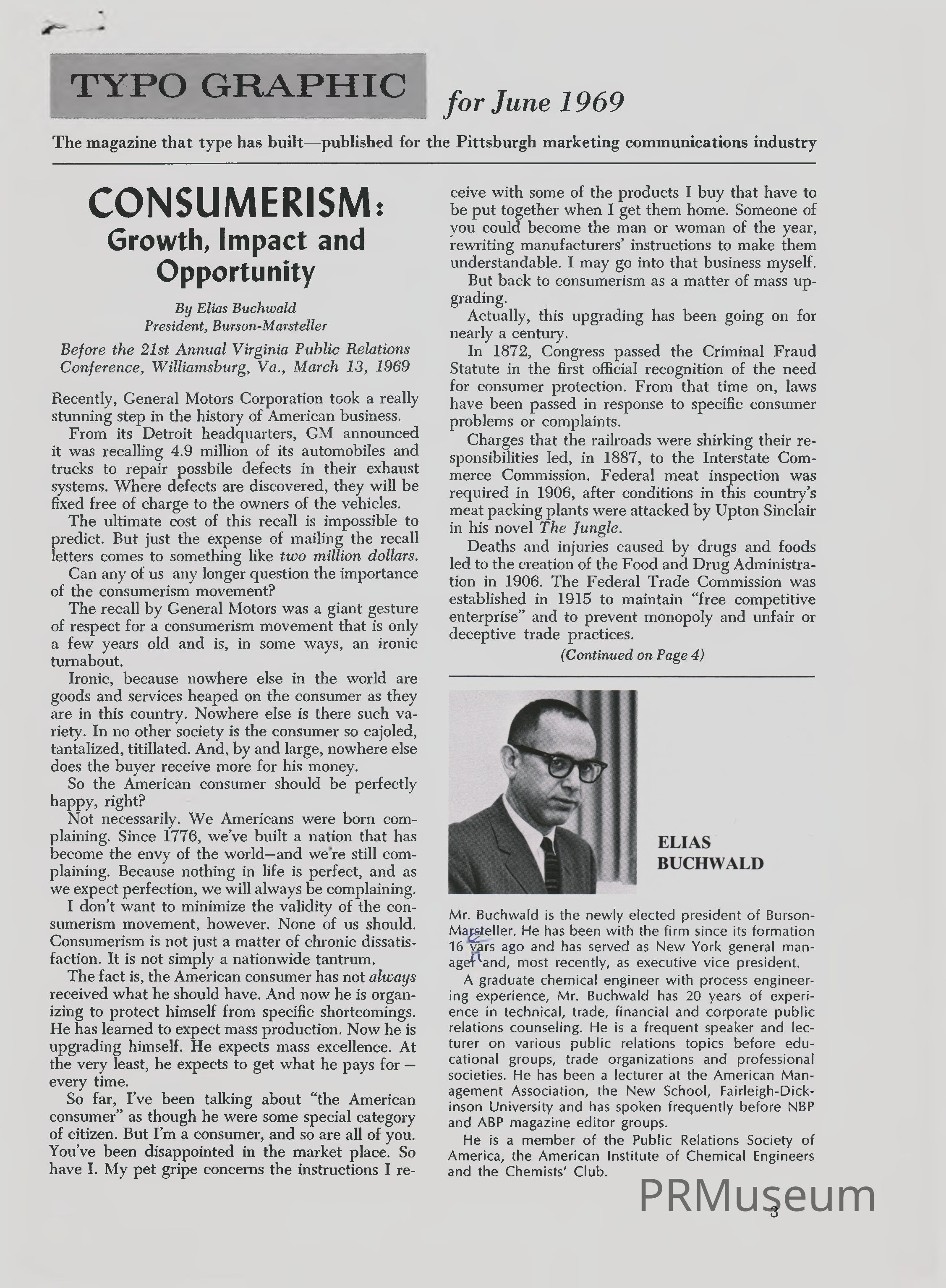 Elias "Buck" Buchwald, President of Burson-Marsteller at the time of publication, wrote about the consumerism movement and General Motors decision to recall 4.9 million automobiles.Collection