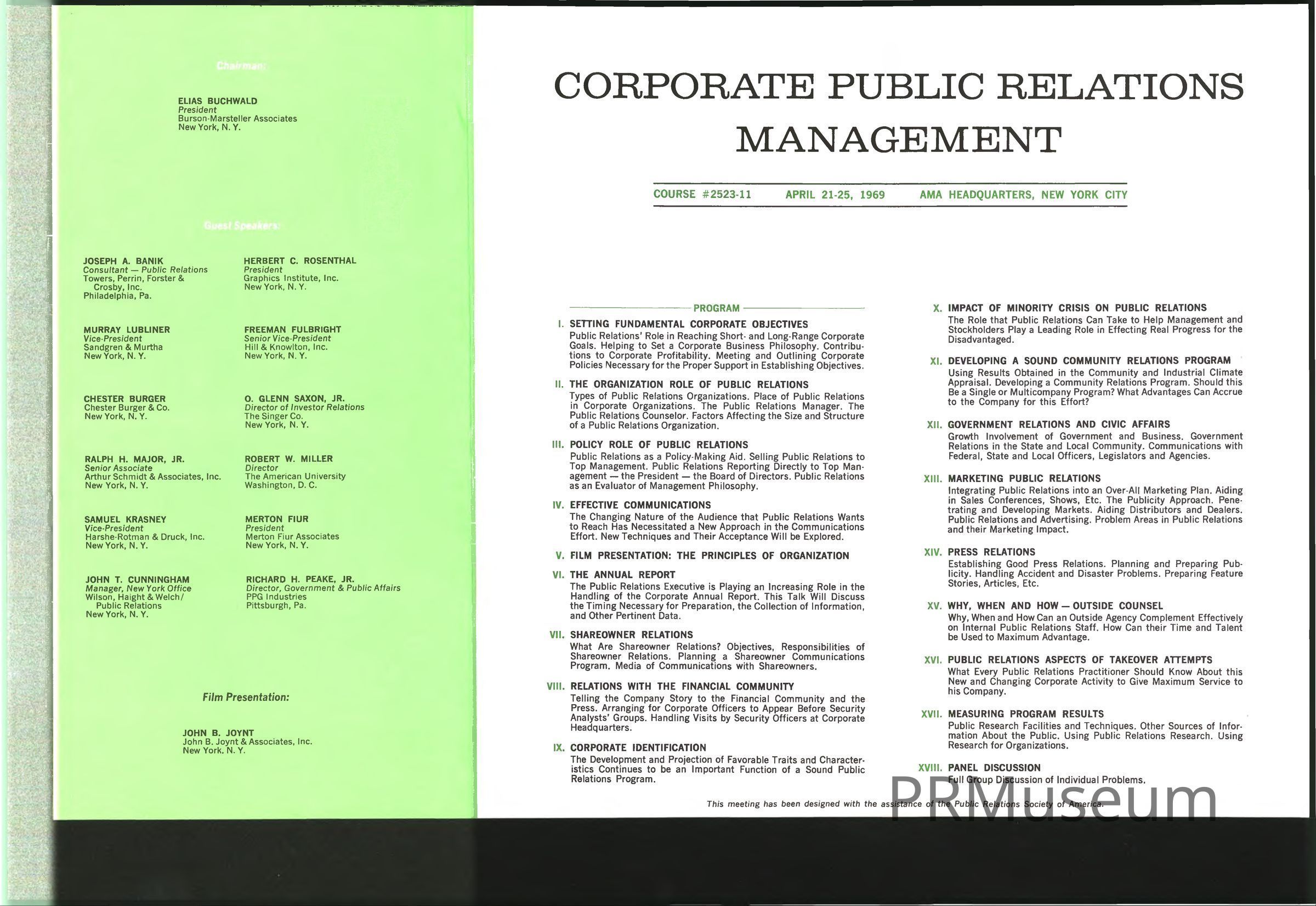 Elias "Buck" Buchwald, Chairman of the AMA assisted with the creation of Corporate Public Relations Management program, a course designed to help PR professionals advance in their careers.Collection