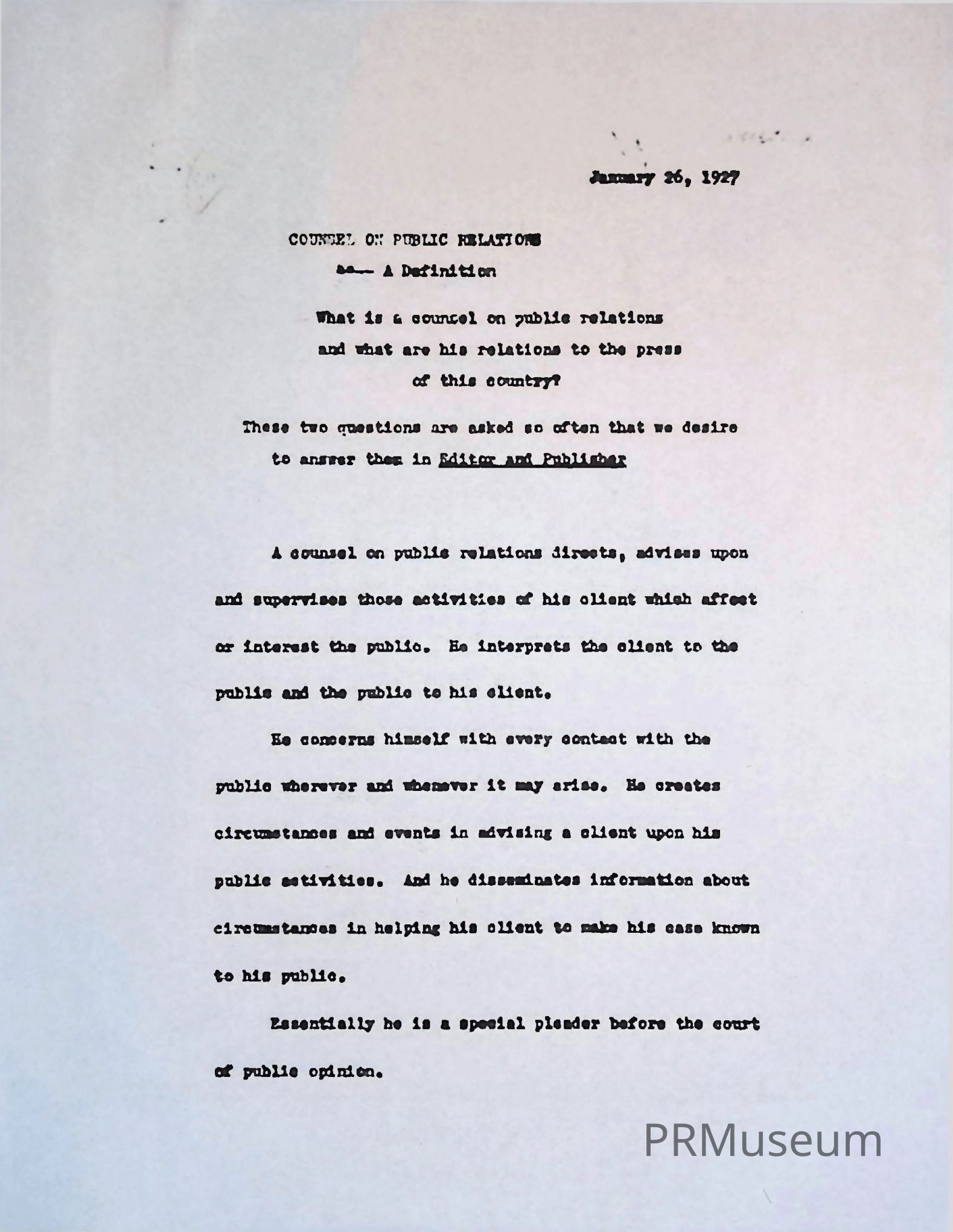 Photocopy of Bernays's definition on what is a counsel on public relations and what are his relations to the press of this country?Created By