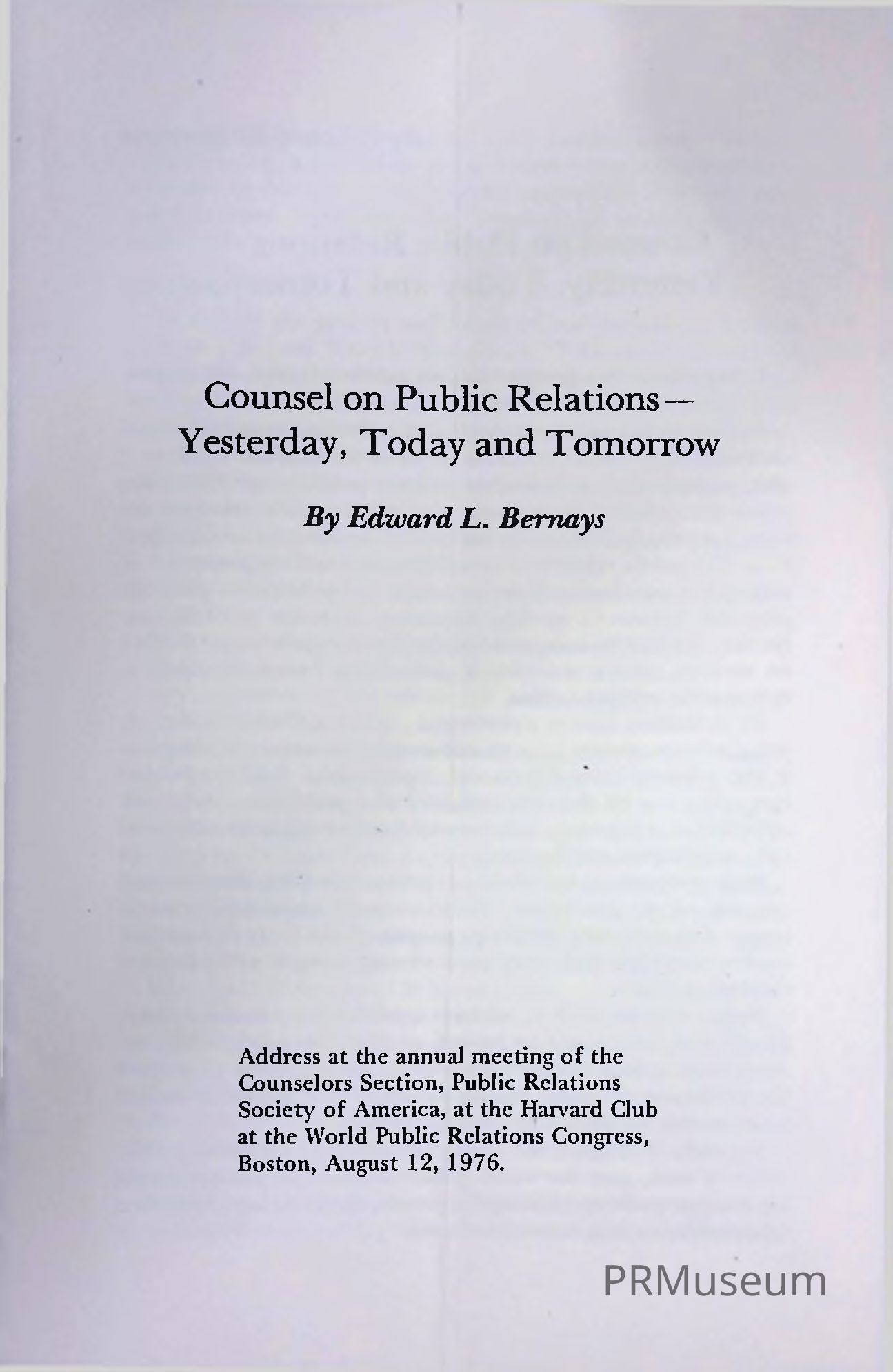 Original reprint; address at the annual meeting of the Counselors Section, Public Relations Society of America, at the Harvard Club at the World Public Relations Congress; as found in Bernays's InboxCreated By
