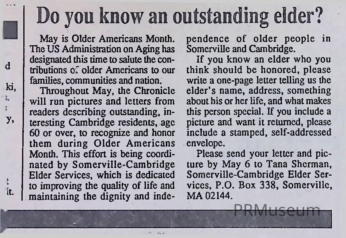 Somerville-Cambridge Elder Services placement for "Older Americans Month (May)." Bernays was a speaker for the US Administration on Aging while he was living in Cambridge.Acquisition