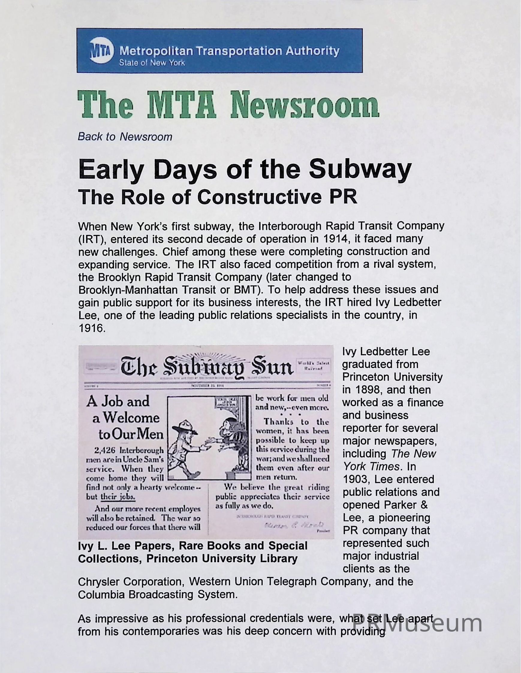 Ivy Lee was a founder of modern public relations. The IRT recruited Ivy Lee to help gain public support for its business interests in efforts to promote the first subway. Ivy Lee's approach to influencing public opinion was through the use of print media such as pamphlets, brochures and posters to "establish a close understanding of its work and policies".Acquisition