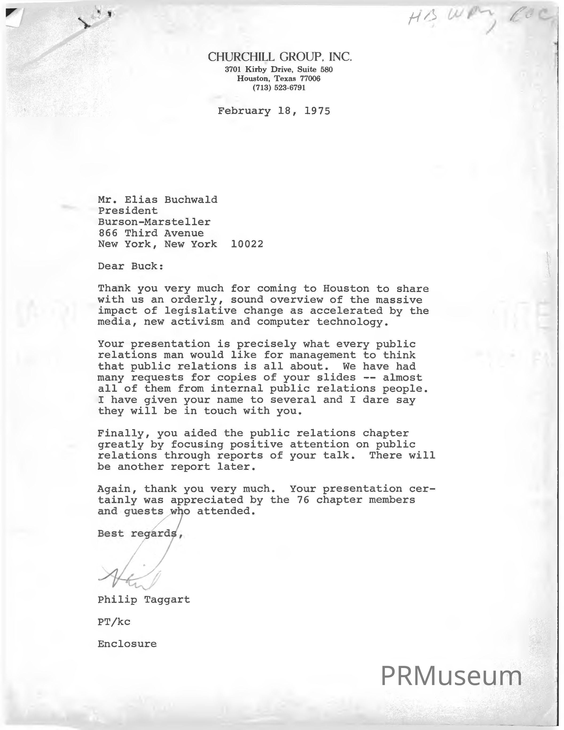 Philip Taggart of Churchill Group Inc. writes a letter to Elias "Buck" Buchwald thanking him for his speech in regards to legislative change brought on by media, new activism and technological advancements in 1975.Collection