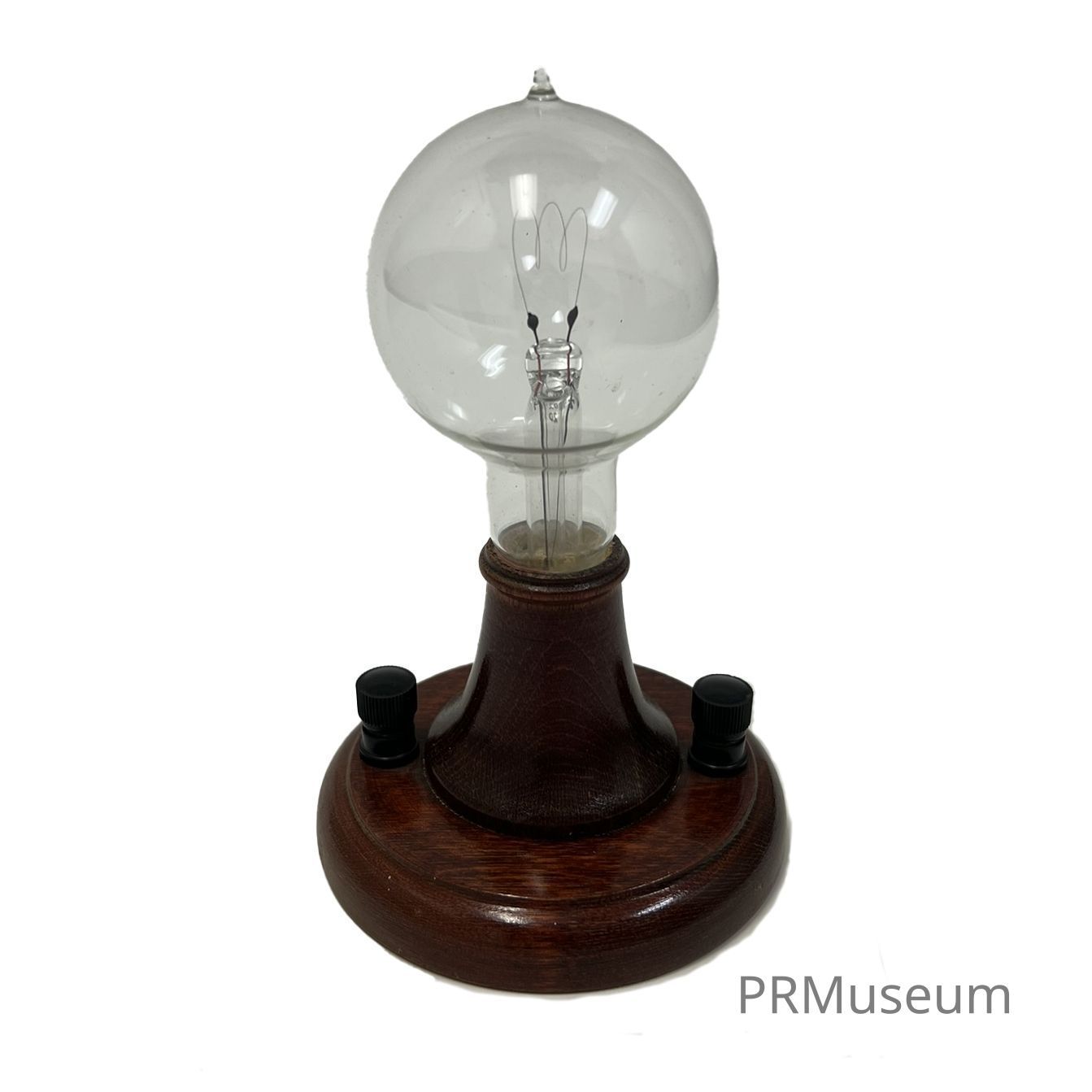 Edison light bulb commemorating the 50th Anniversary of Edison's 1879 light bulb, on wood baseTags