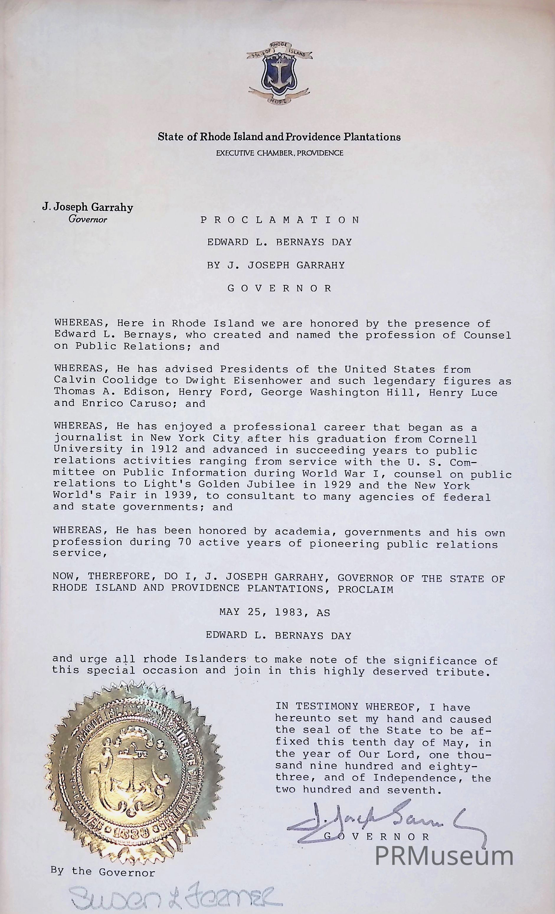 Edward Bernays Day Proclamation 052583Entry/Object ID