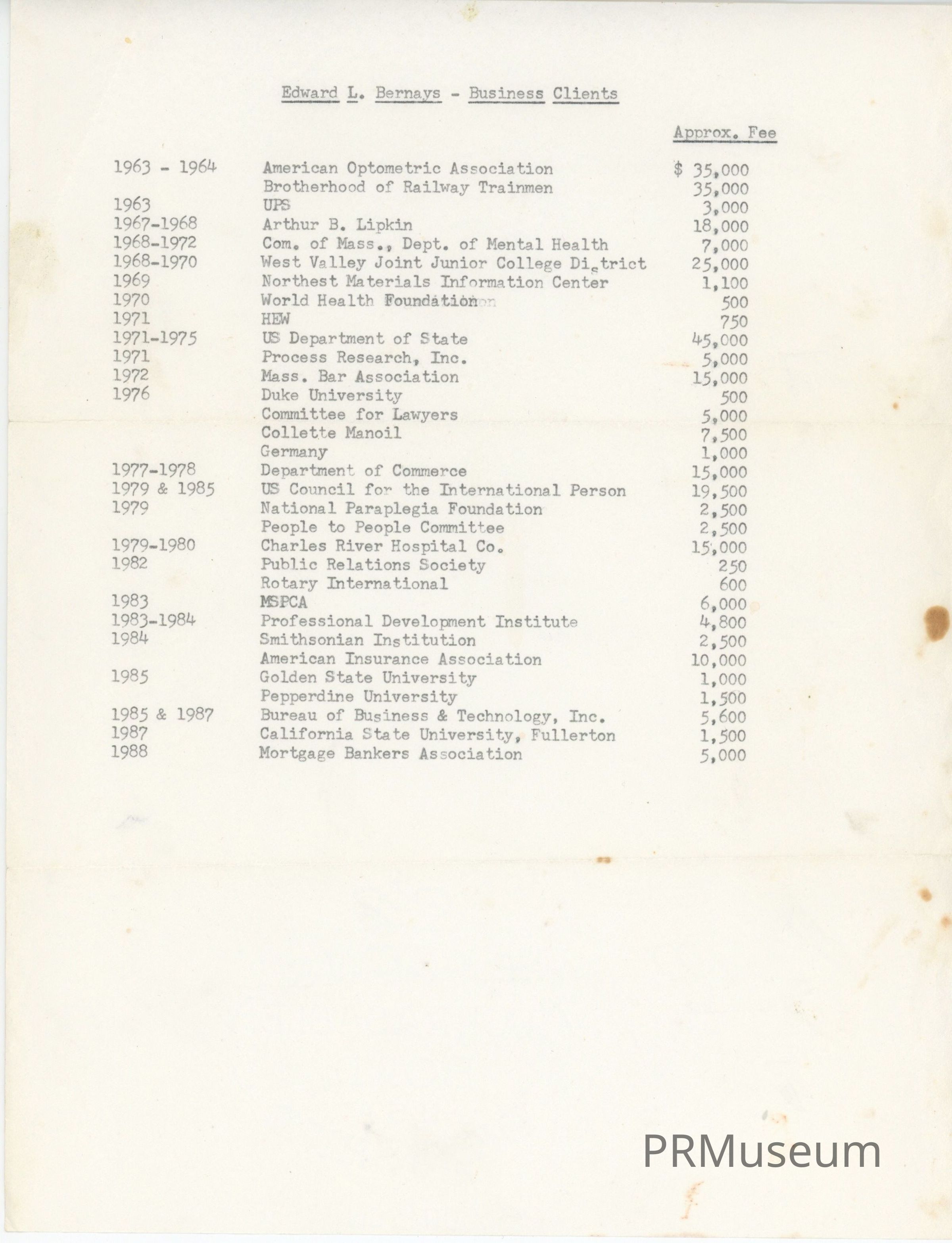 Typewritten document of a list of Bernays' clients from 1963–1988 and approximate fees for services.Acquisition