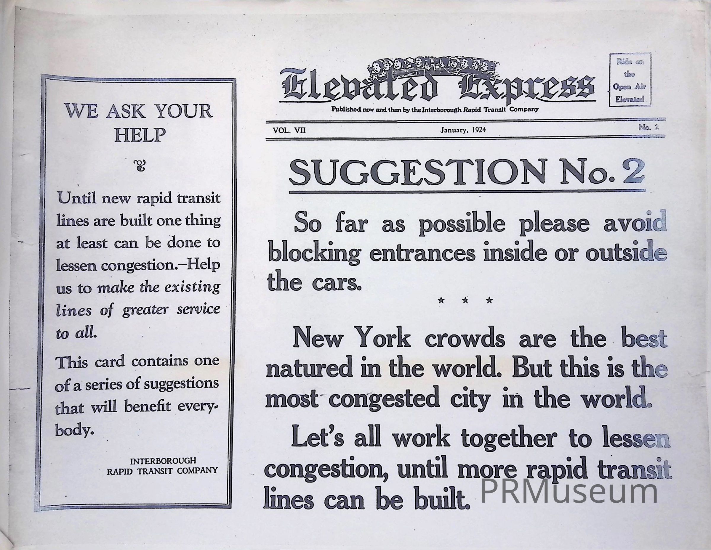 Interborough Rapid Transit poster from 1924 advising people to avoid causing congestion.Context