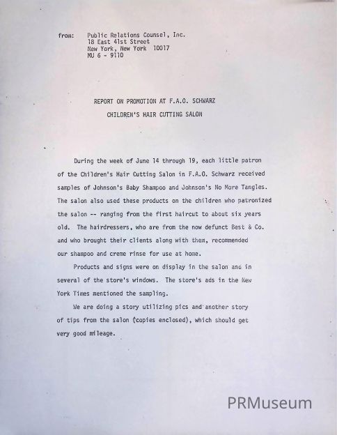 1971 tie-in with F.A.O. Schwarz and J&J Baby Shampoo for patrons at the salon, ranging from their first haircut to about six years old.Context