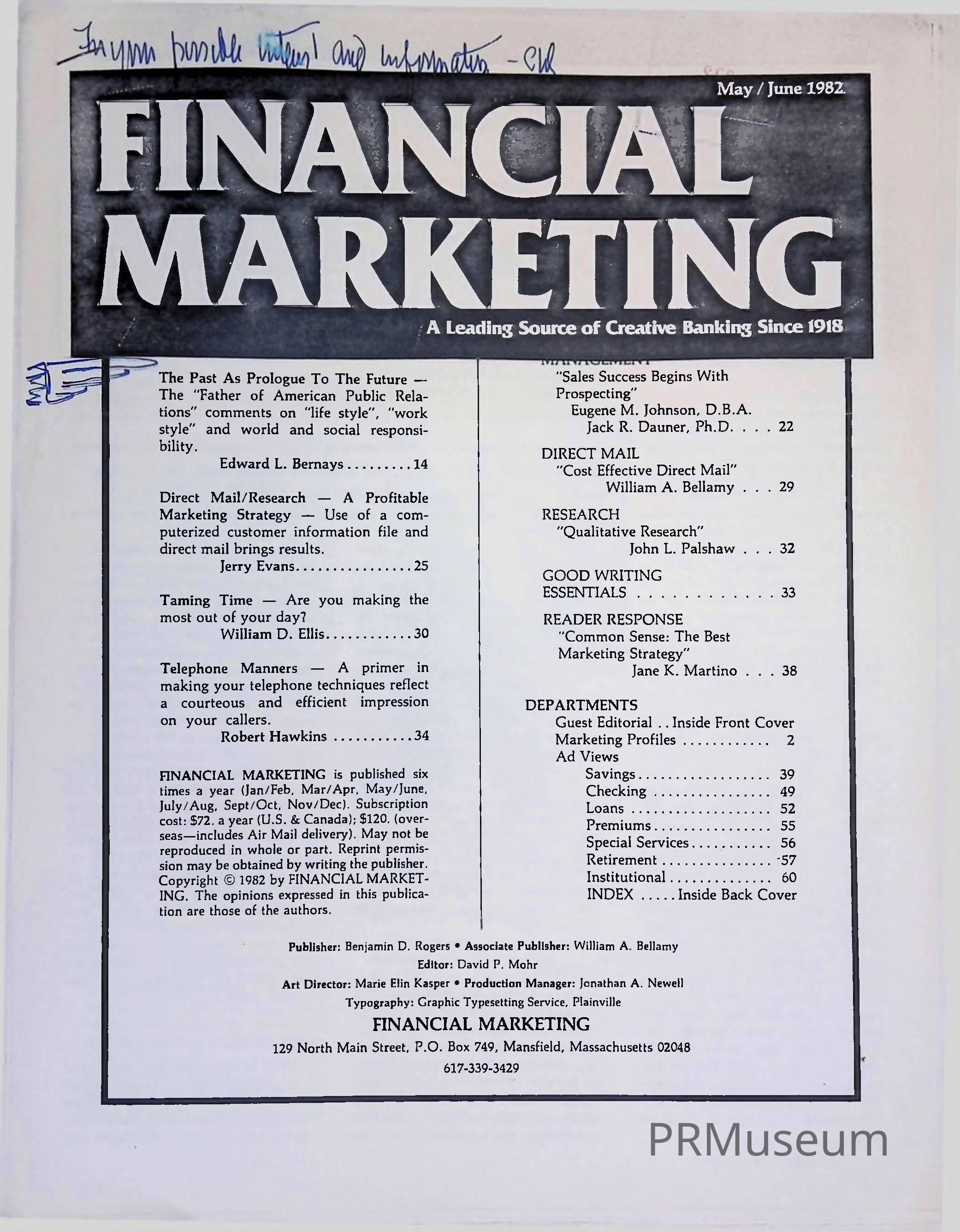 Financial Marketing was a newspaper publication formed in 1918 and published six times a year, reporting on the financial marketing industry. In this publication, Financial Marketing included a speech given by Edward Bernays, also known as the "father of public relations". In his speech entitled "The Past As Prologue To the Future", Bernays reveals some warm and personal observations drawn from his experience in a career that spans seven decades as an advisor to presidents, business and industrial leaders.Acquisition