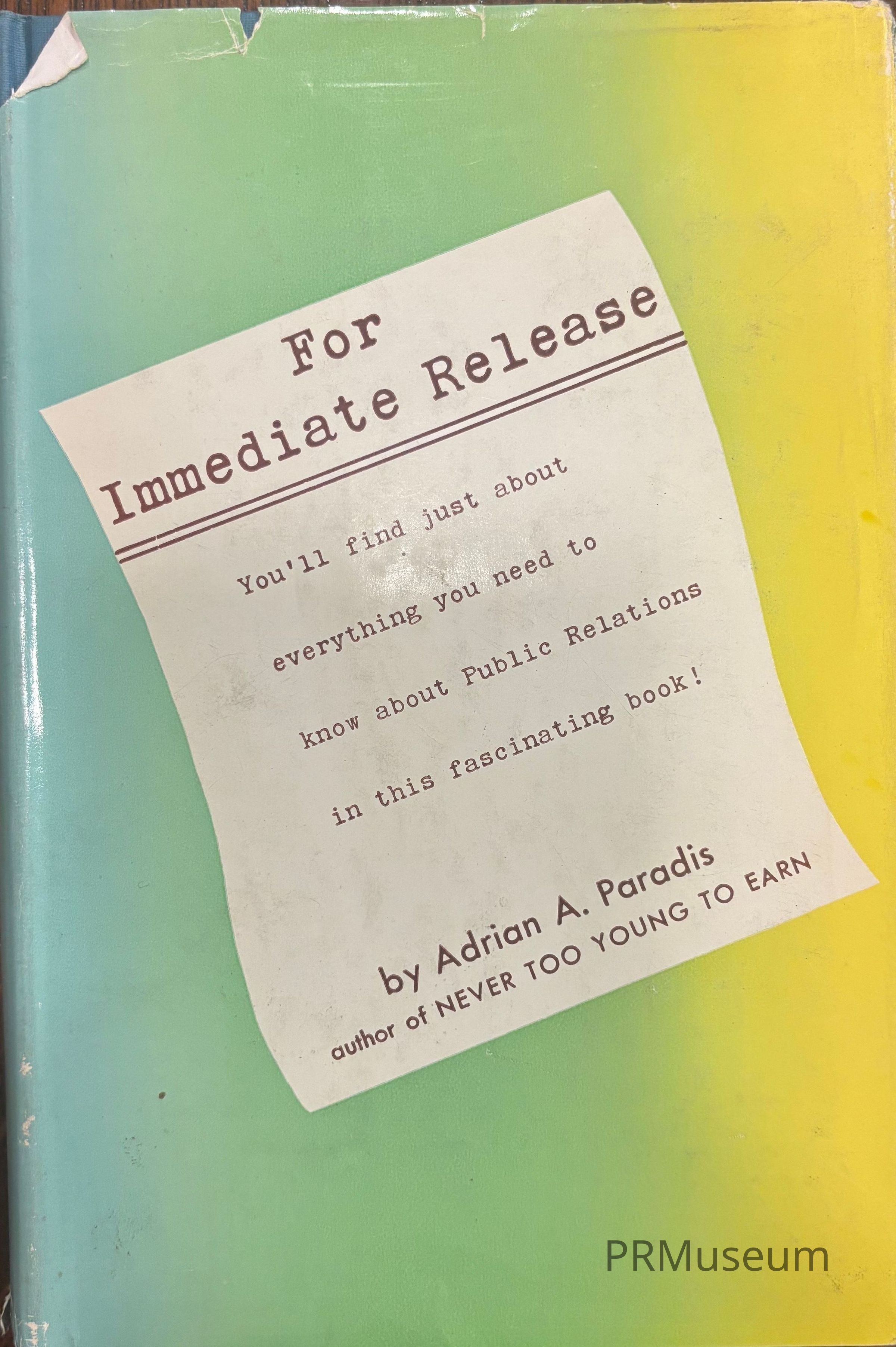Adrian A. Paradis was businessman and author. "For Immediate Release" is intended to guide young people who are interested in the field of public relations and how to profit from such a rewarding career. The book features a testimonial from Edward Bernays who stated "Young people attracted to new careers of publicity and public relations will find For "Immediate Release" a comprehensive reference guide to these exciting and socially productive fields."Acquisition