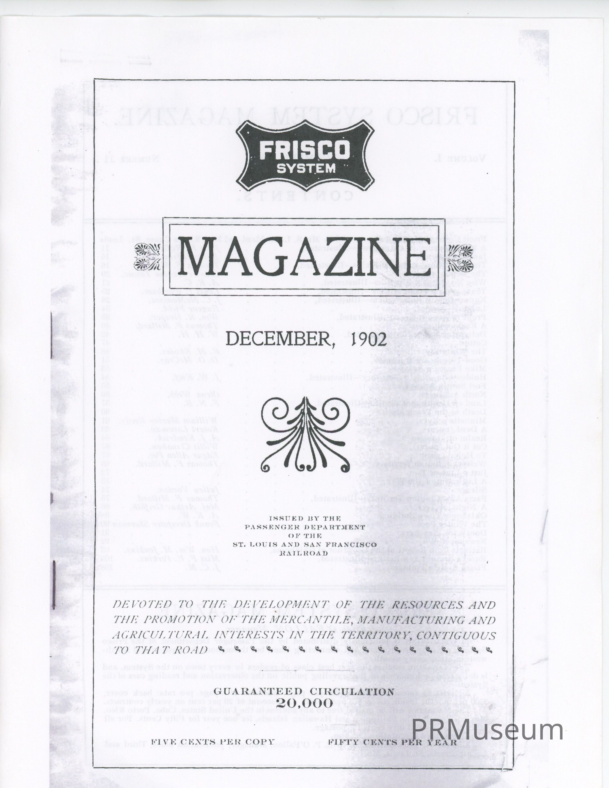 The Frisco System was a major railroad service based in St. Louis Missouri that served nine states. The magazine was distributed by Frisco to its own railroad lines, connecting lines and throughout the Eastern and Northwestern states monthly. Frisco also offered advertising rates for companies who would like to promote their businesses which helped brand awareness.Publication Details