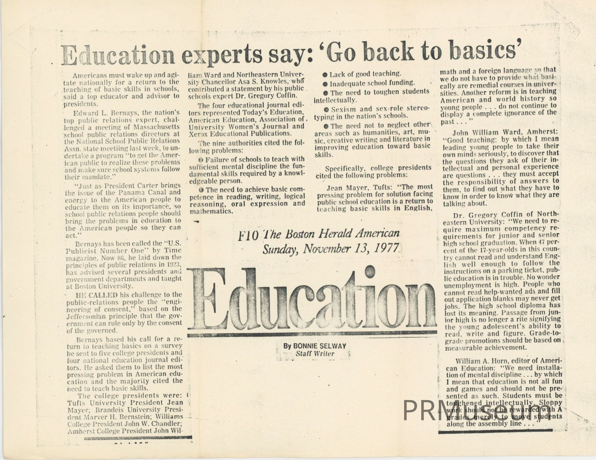 From the Boston Herald American Education section November 13, 1977, "Education Experts Say, 'Go Back to Basics'" citing Bernays (5 copies)Created By